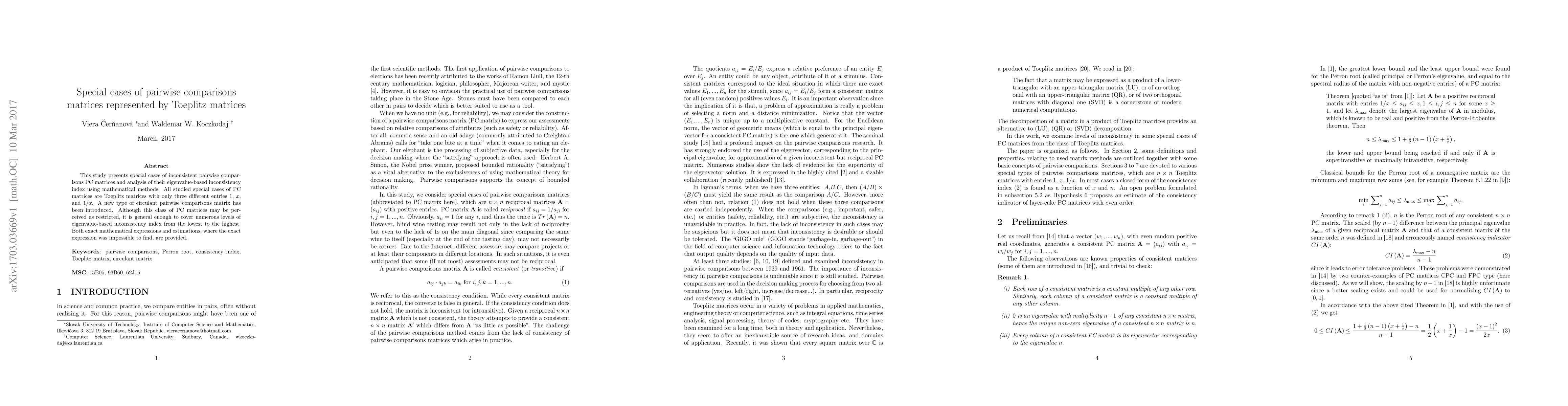 This study explores special cases of pairwise comparisons matrices represented by Toeplitz matrices, focusing on their inconsistency indices. It introduces a new type of circulant matrix and provides both exact and estimated eigenvalue-based inconsistency indices for these matrices.