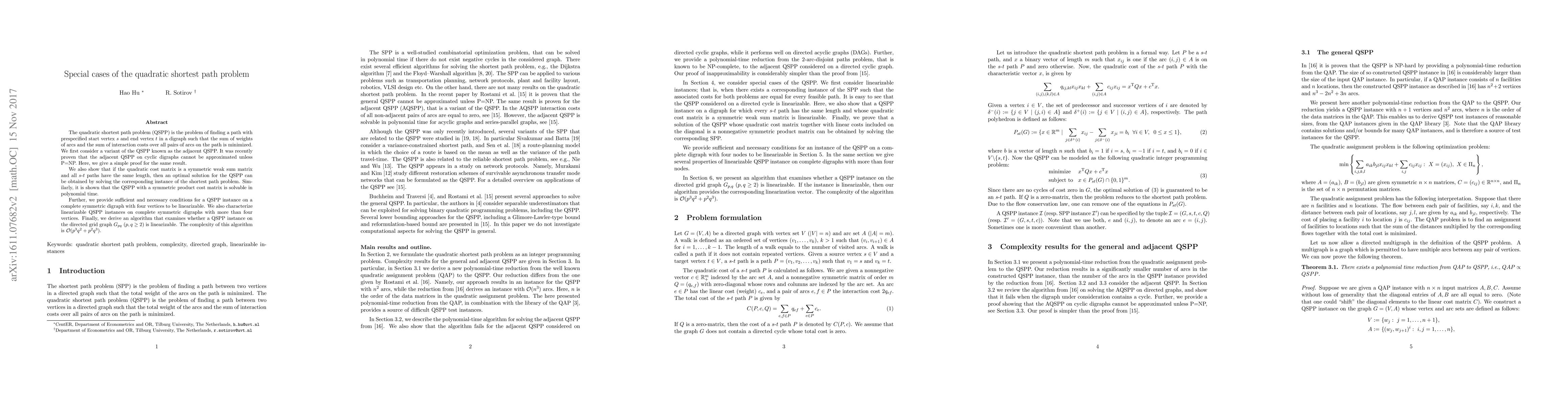 The quadratic shortest path problem (QSPP) is \textcolor{black}{the problem of finding a path with prespecified start vertex $s$ and end vertex $t$ in a digraph} such that the sum of weights of arcs and the sum of interaction costs over all pairs of arcs on the path is minimized. We first consider a variant of the QSPP known as the adjacent QSPP. It was recently proven that the adjacent QSPP on cyclic digraphs cannot be approximated unless P=NP. Here, we give a simple proof for the same result. We also show that if the quadratic cost matrix is a symmetric weak sum matrix \textcolor{black}{ and all $s$-$t$ paths have the same length,} then an optimal solution for the QSPP can be obtained by solving the corresponding instance of the shortest path problem. Similarly, it is shown that the QSPP with a symmetric product cost matrix is solvable in polynomial time. Further, we provide sufficient and necessary conditions for a QSPP instance on a complete symmetric digraph with four vertices to be linearizable. We also characterize linearizable QSPP instances on complete symmetric digraphs with more than four vertices. Finally, we derive an algorithm that examines whether a QSPP instance on the directed grid graph $G_{pq}$ ($p,q\geq 2$) is linearizable. The complexity of this algorithm is ${\mathcal{O}(p^{3}q^{2}+p^{2}q^{3})}$.