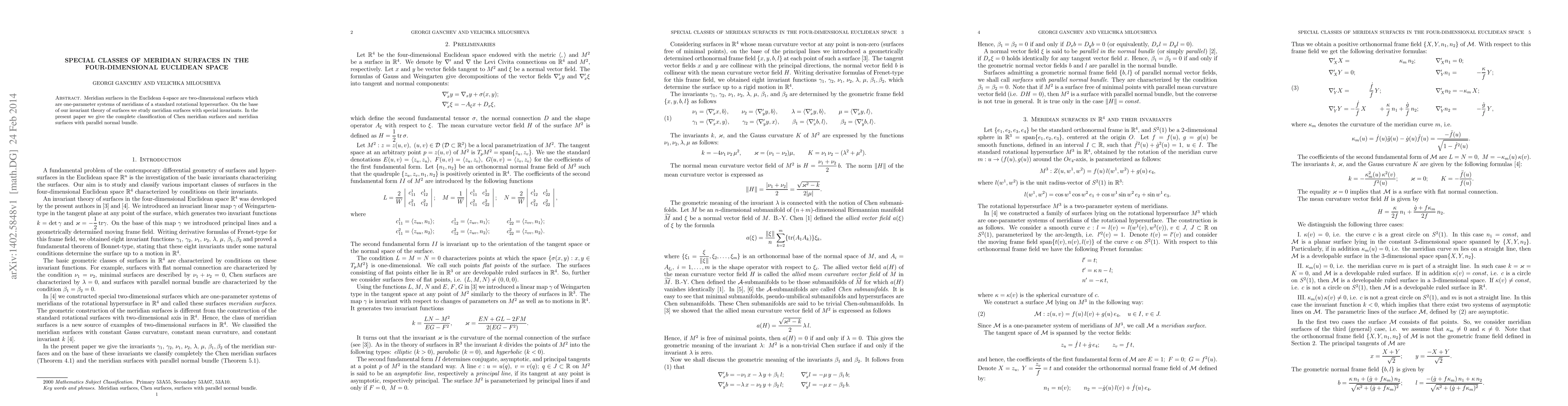 This paper classifies meridian surfaces in four-dimensional Euclidean space based on special invariants, focusing on Chen meridian surfaces and those with a parallel normal bundle using invariant theory. The complete classification of these special classes is provided.