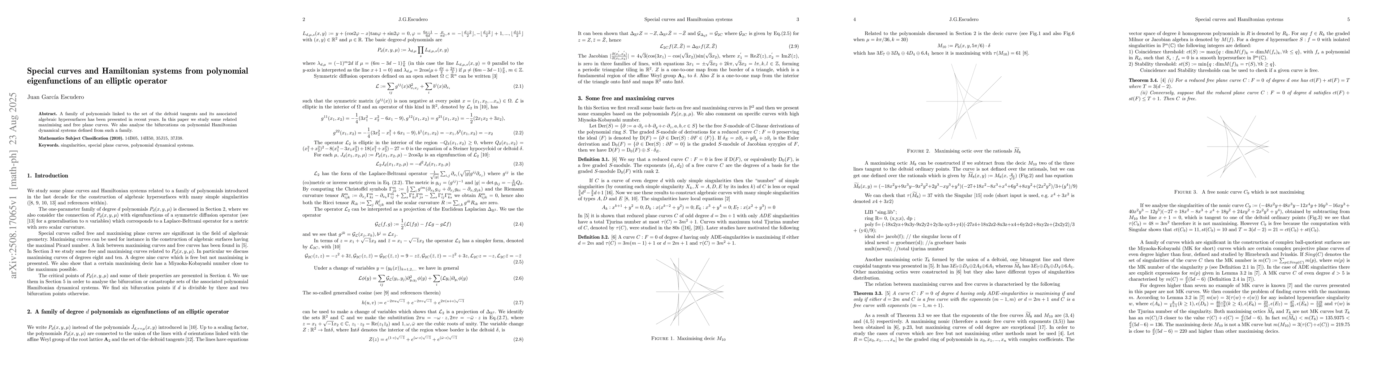 A family of polynomials linked to the set of the deltoid tangents and its associated algebraic hypersurfaces has been presented in recent years. In this paper we study some related maximising and free plane curves. We also analyse the bifurcations on polynomial Hamiltonian dynamical systems defined from such a family.