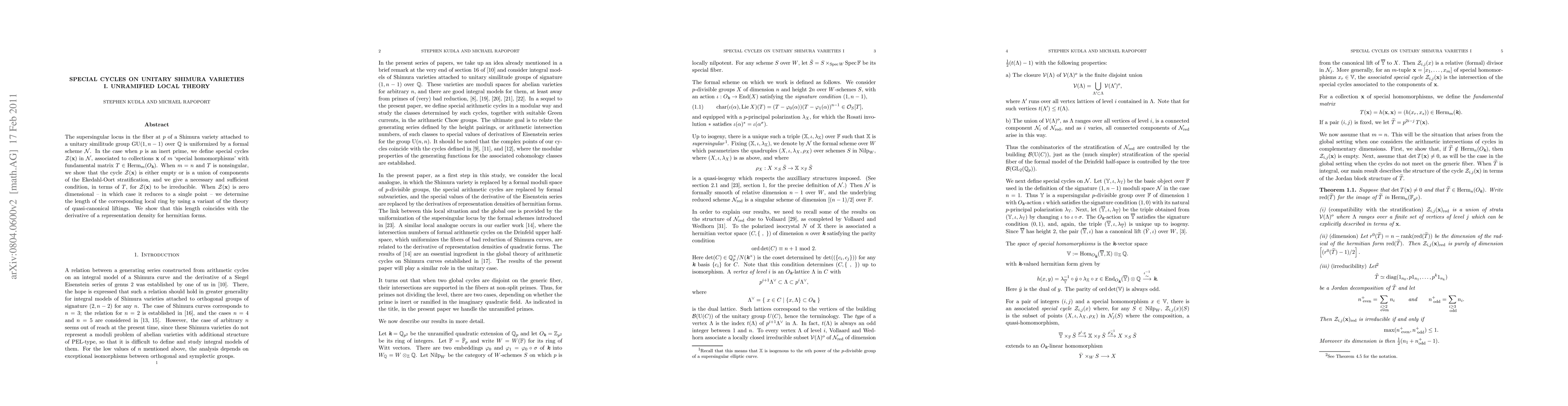 The supersingular locus in the fiber at p of a Shimura variety attached to a unitary similitude group GU(1,n-1) over Q is uniformized by a formal scheme \Cal N. In the case when p is inert, we define special cycles Z(x) in \Cal N, associated to a collection x of m `special homomorphisms' with fundamental matrix T in Herm_m(OK). When m=n and T is nonsingular, we show that the cycle Z(x) is a union of components of the Ekedahl-Oort stratification, and we give a necessary and sufficient conditions, in terms of T, for Z(x) to be irreducible. When Z(x) is zero dimensional -- in which case it reduces to a single point -- we determine the length of the corresponding local ring by using a variant of the theory of quasi-canonical liftings. We show that this length coincides with the derivative of a representation density for hermitian forms.