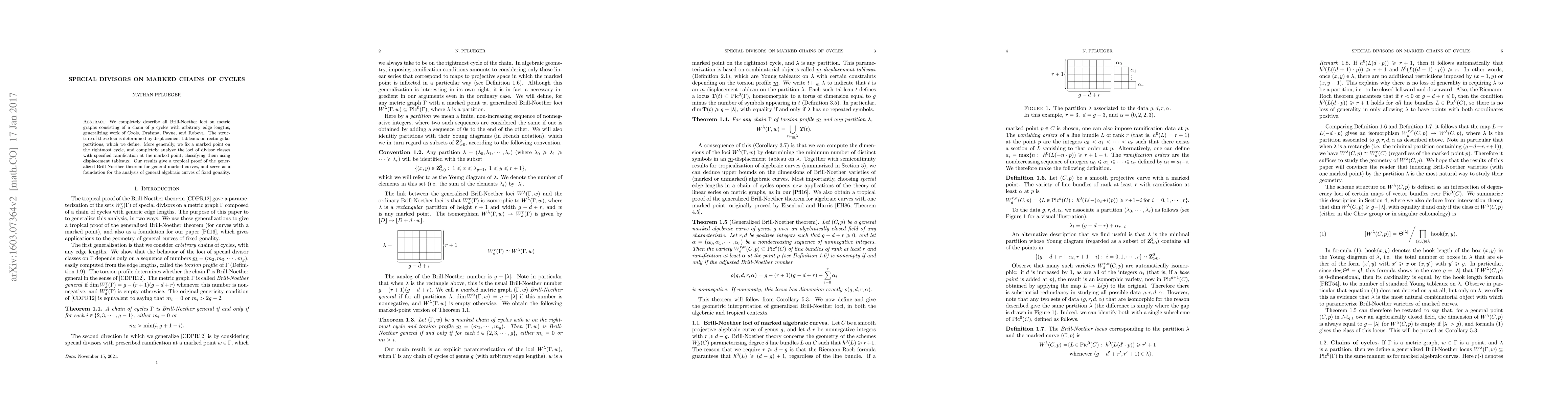We completely describe all Brill-Noether loci on metric graphs consisting of a chain of g cycles with arbitrary edge lengths, generalizing work of Cools, Draisma, Payne, and Robeva. The structure of these loci is determined by displacement tableaux on rectangular partitions, which we define. More generally, we fix a marked point on the rightmost cycle, and completely analyze the loci of divisor classes with specified ramification at the marked point, classifying them using displacement tableaux. Our results give a tropical proof of the generalized Brill-Noether theorem for general marked curves, and serve as a foundation for the analysis of general algebraic curves of fixed gonality.