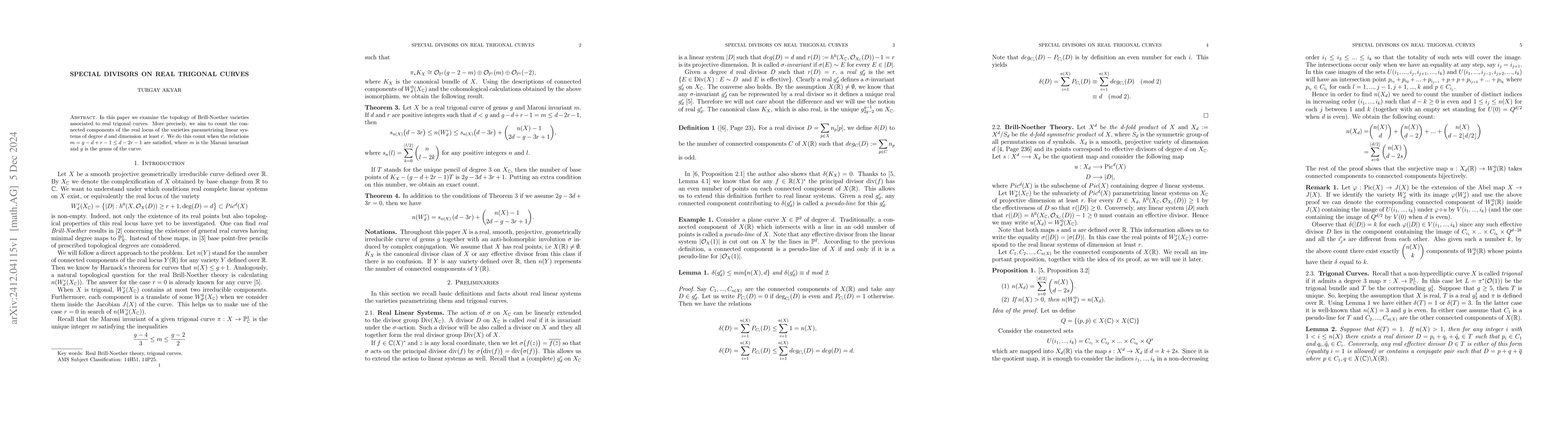 This paper investigates the topology of Brill-Noether varieties for real trigonal curves, focusing on counting the connected components of their real loci. It achieves this by analyzing linear systems of degree $d$ and dimension at least $r$, under specific relations involving the Maroni invariant and the genus of the curve.
