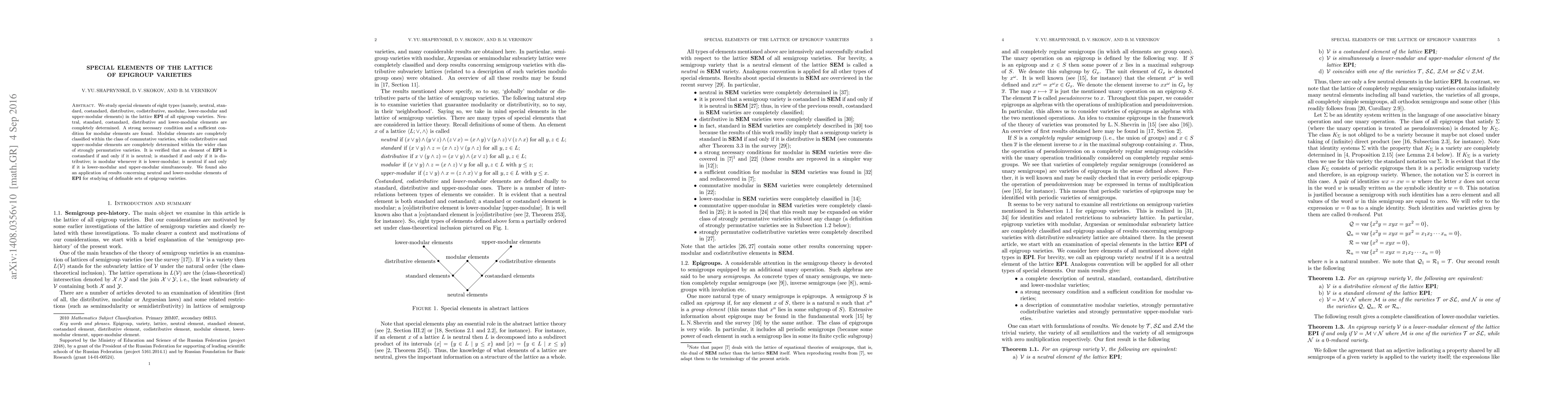 This paper investigates various special elements within the lattice EPI of all epigroup varieties, determining properties of neutral, standard, costandard, distributive, and modular elements, and classifying them within specific classes. It also establishes necessary and sufficient conditions for modular elements and explores applications to definable sets of epigroup varieties.