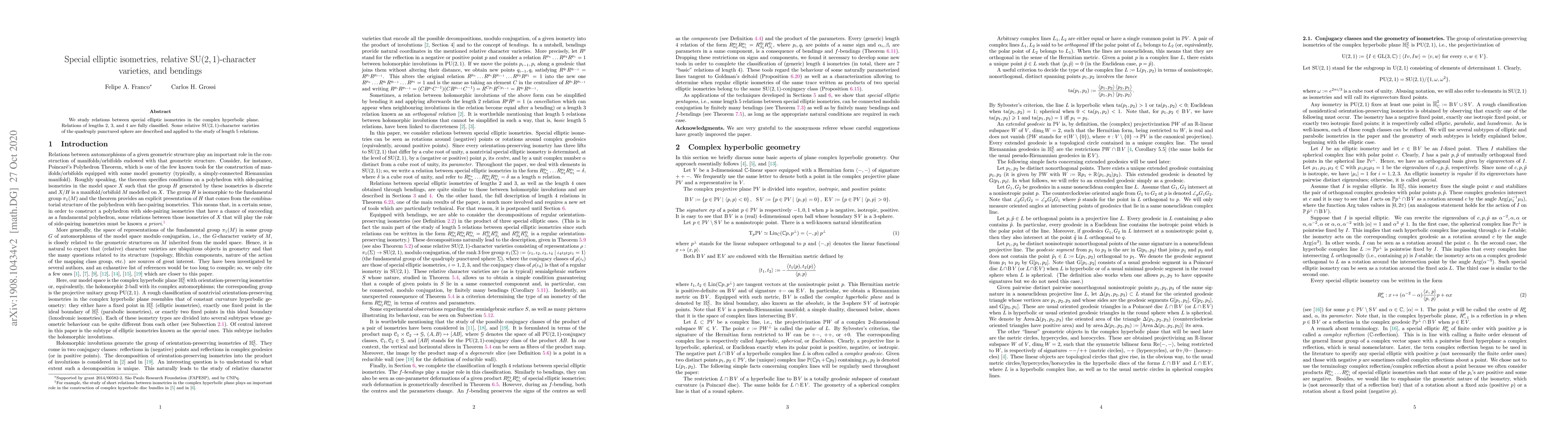 We study relations between special elliptic isometries in the complex hyperbolic plane. Relations of lengths 2, 3, and 4 are fully classified. Some relative SU(2,1)-character varieties of the quadruply punctured sphere are described and applied to the study of length 5 relations.