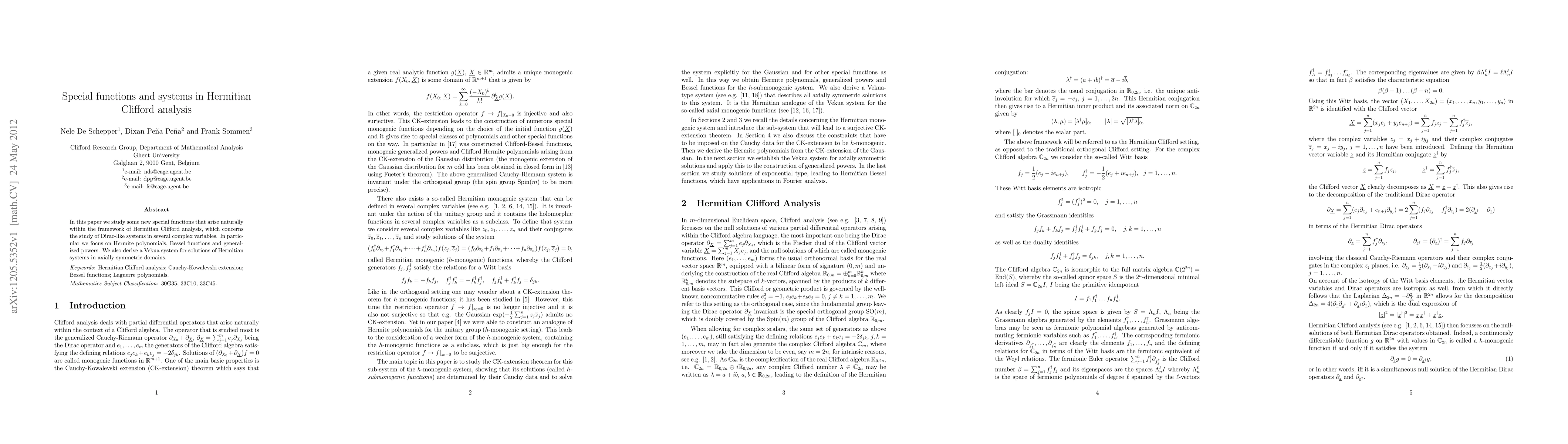 In this paper we study some new special functions that arise naturally within the framework of Hermitian Clifford analysis, which concerns the study of Dirac-like systems in several complex variables. In particular we focus on Hermite polynomials, Bessel functions and generalized powers. We also derive a Vekua system for solutions of Hermitian systems in axially symmetric domains.