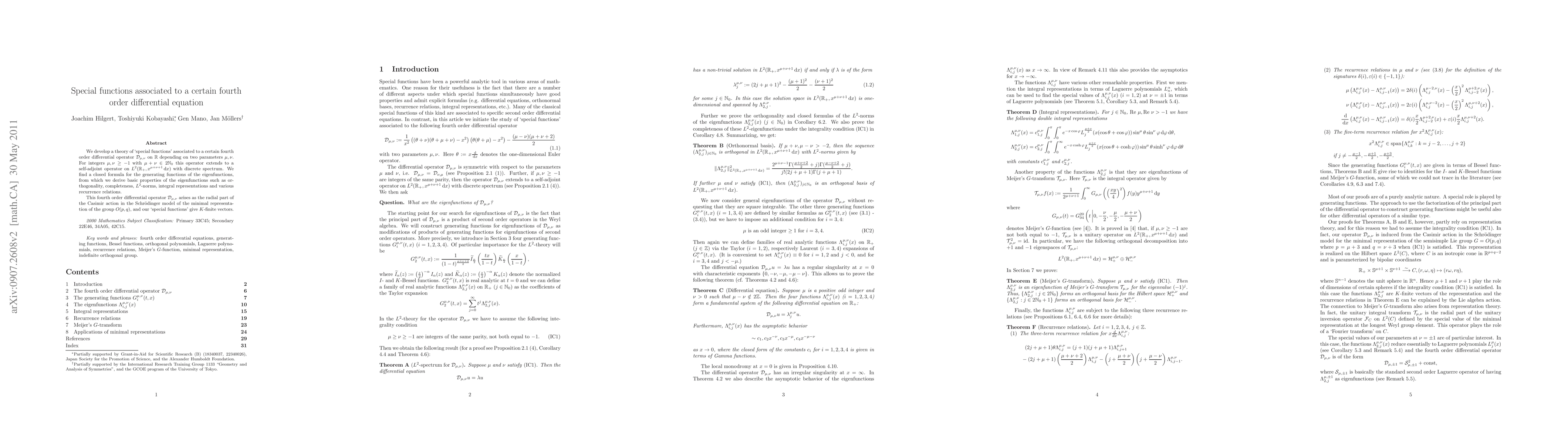 This paper develops a theory of special functions linked to a fourth-order differential operator $\mathcal{D}_{\mu,\nu}$ with discrete spectrum, deriving properties like orthogonality and recurrence relations. These functions arise in the context of the Schrödinger model of the minimal representation of the group $O(p,q)$.