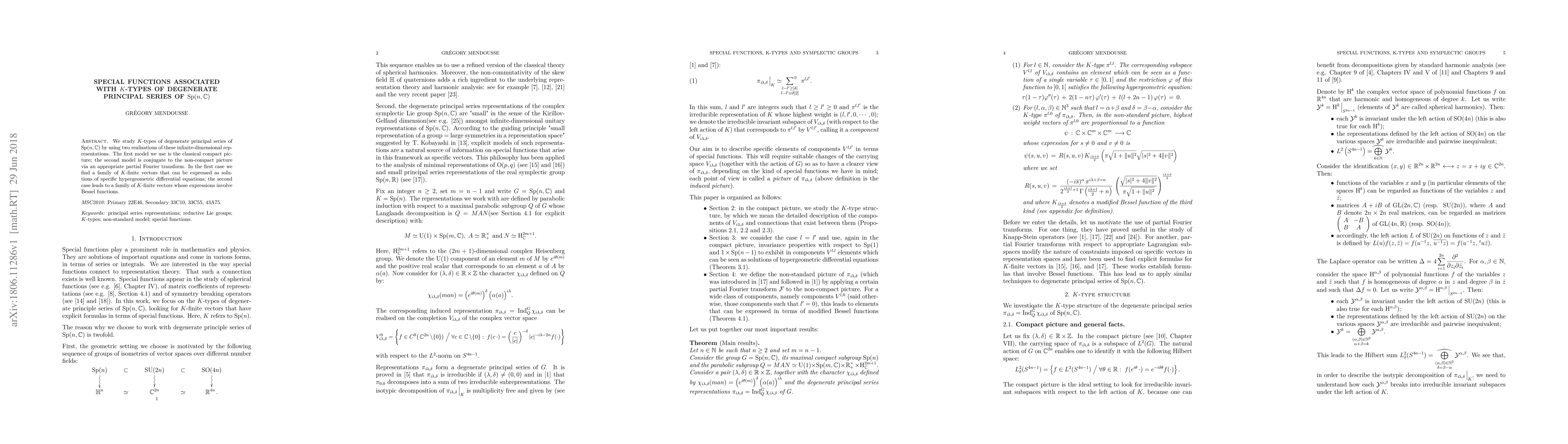 This research paper explores K-types of degenerate principal series of Sp(n,C) using two realisations, finding K-finite vectors expressed as solutions to hypergeometric differential equations in one case and Bessel functions in the other.