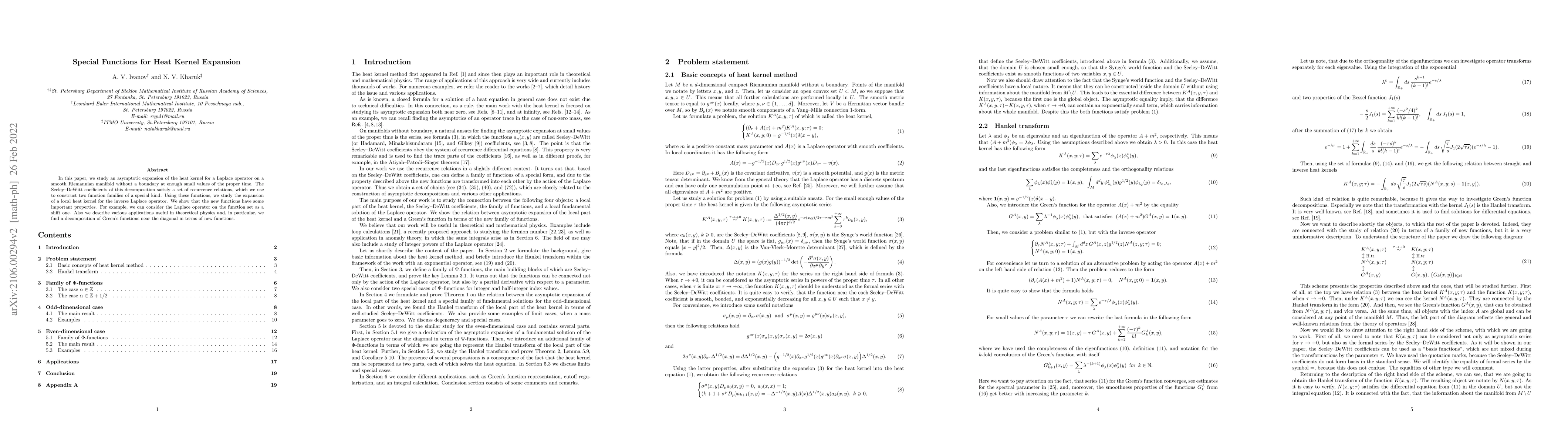 This paper investigates the asymptotic expansion of the heat kernel for the Laplace operator on a smooth Riemannian manifold, constructing special function families that satisfy recurrence relations. These functions enable the study of the local heat kernel for the inverse Laplace operator, revealing properties useful in theoretical physics, including a decomposition of Green's functions.