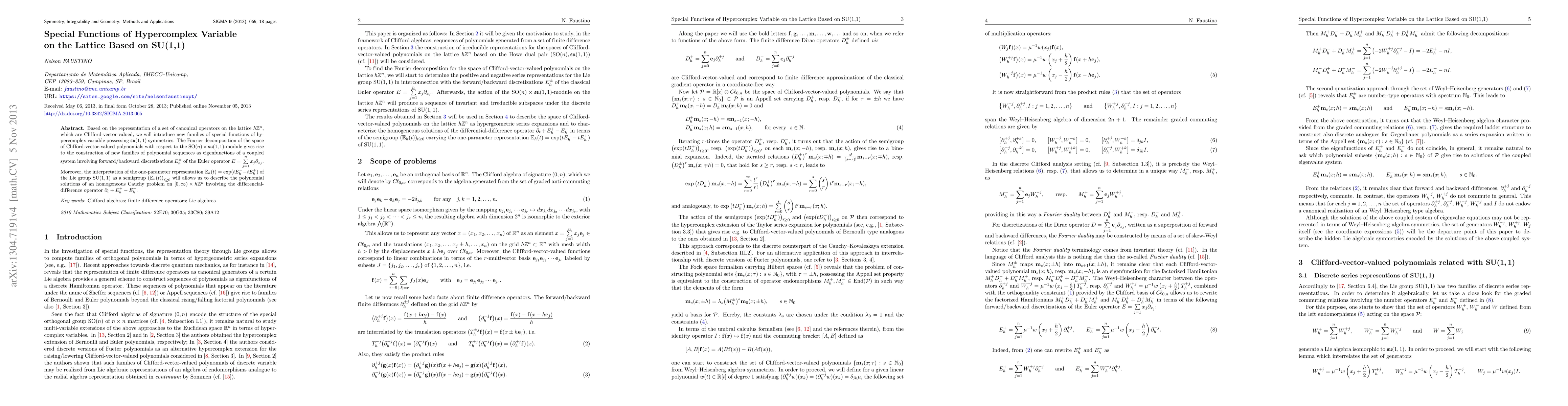 Based on the representation of a set of canonical operators on the lattice $h\mathbb{Z}^n$, which are Clifford-vector-valued, we will introduce new families of special functions of hypercomplex variable possessing $\mathfrak{su}(1,1)$ symmetries. The Fourier decomposition of the space of Clifford-vector-valued polynomials with respect to the ${\rm SO}(n)\times \mathfrak{su}(1,1)$-module gives rise to the construction of new families of polynomial sequences as eigenfunctions of a coupled system involving forward/backward discretizations $E_h^{\pm}$ of the Euler operator $E=\sum\limits_{j=1}^nx_j \partial_{x_j}$. Moreover, the interpretation of the one-parameter representation $\mathbb{E}_h(t)=\exp(tE_h^--tE_h^+)$ of the Lie group ${\rm SU}(1,1)$ as a semigroup $\left(\mathbb{E}_h(t)\right)_{t\geq 0}$ will allows us to describe the polynomial solutions of an homogeneous Cauchy problem on $[0,\infty)\times h{\mathbb Z}^n$ involving the differencial-difference operator $\partial_t+E_h^+-E_h^-$.