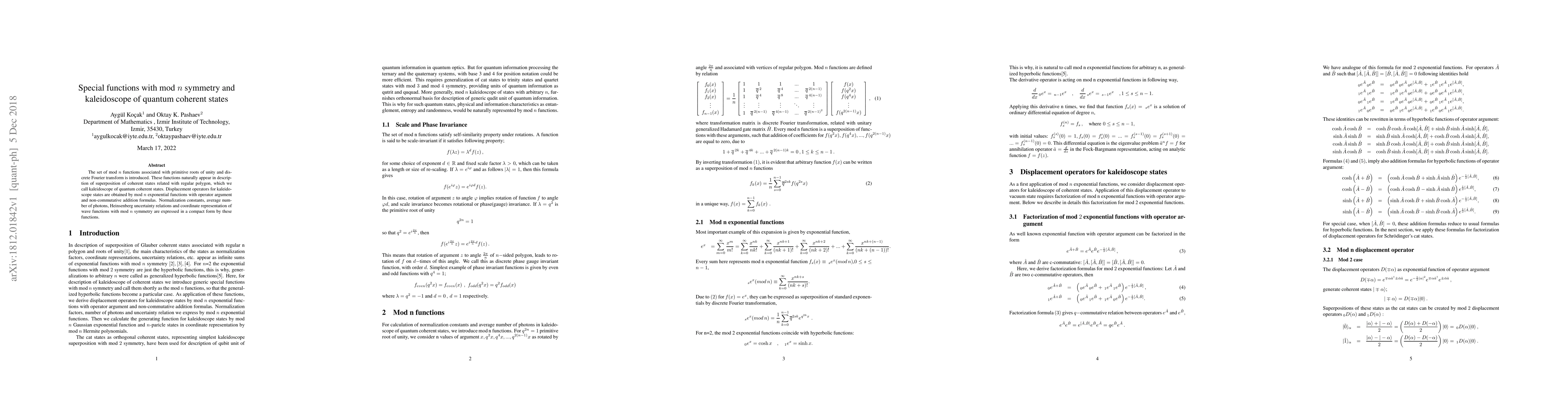 This paper introduces a set of mathematical functions with mod n symmetry that describe a type of quantum coherent state called the kaleidoscope, enabling compact expressions for its properties.