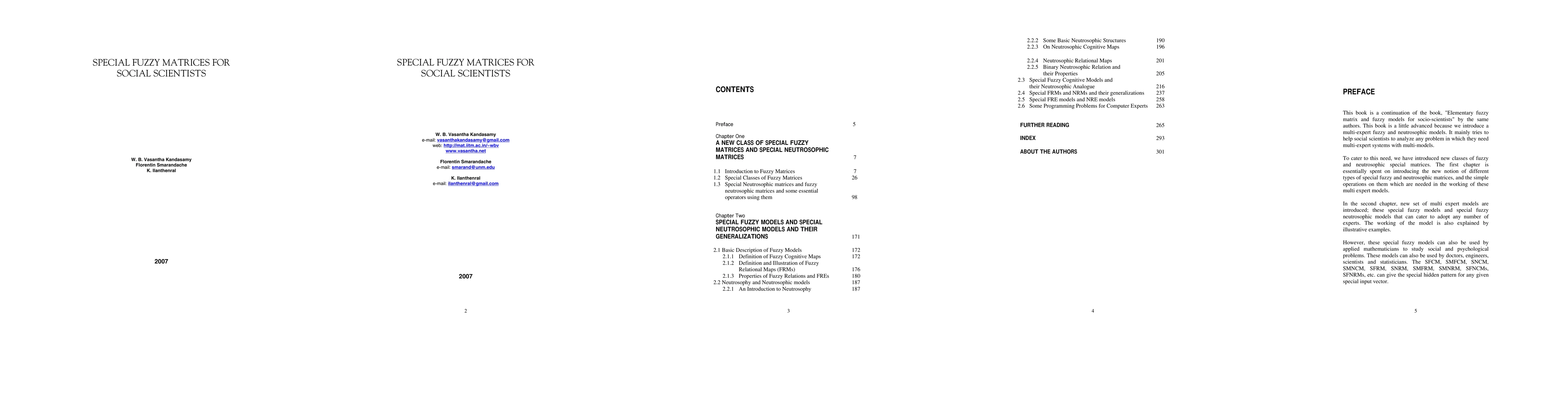 This book presents special classes of Fuzzy and Neutrosophic matrices for constructing multi-expert models, including FCM, FRM, and FRE. It introduces a multi-model system called the Super Special Hexagonal Fuzzy and Neutrosophic model, which can efficiently solve complex problems when implemented with computer programming.