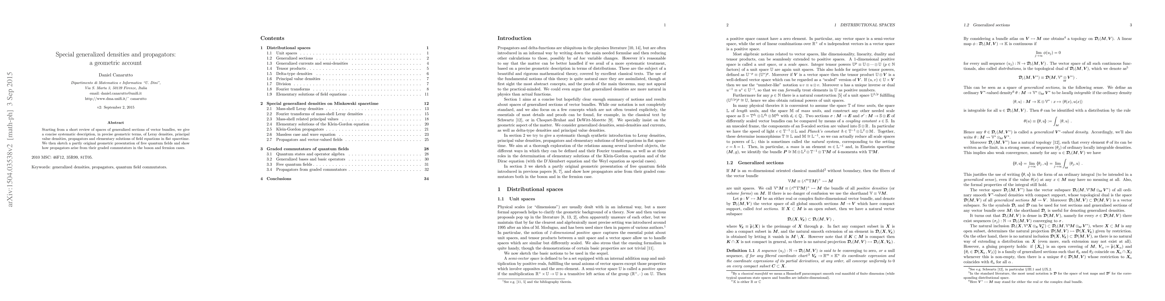 This paper provides a geometric framework for understanding Leray densities, principal value densities, and propagators in flat spacetime, linking these concepts to the graded commutators of free quantum fields in both boson and fermion cases. The study emphasizes a systematic description of generalized sections of vector bundles.