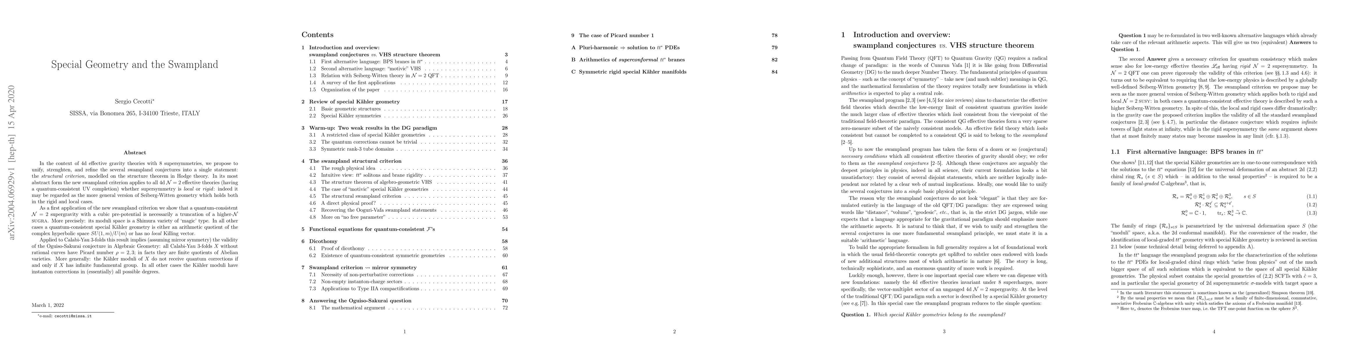 In the context of 4d effective gravity theories with 8 supersymmetries, we propose to unify, strenghten, and refine the several swampland conjectures into a single statement: the structural criterion, modelled on the structure theorem in Hodge theory. In its most abstract form the new swampland criterion applies to all 4d $\mathcal{N}=2$ effective theories (having a quantum-consistent UV completion) whether supersymmetry is \emph{local} or rigid: indeed it may be regarded as the more general version of Seiberg-Witten geometry which holds both in the rigid and local cases. As a first application of the new swampland criterion we show that a quantum-consistent $\mathcal{N}=2$ supergravity with a cubic pre-potential is necessarily a truncation of a higher-$\mathcal{N}$ \textsc{sugra}. More precisely: its moduli space is a Shimura variety of `magic' type. In all other cases a quantum-consistent special K\"ahler geometry is either an arithmetic quotient of the complex hyperbolic space $SU(1,m)/U(m)$ or has no \emph{local} Killing vector. Applied to Calabi-Yau 3-folds this result implies (assuming mirror symmetry) the validity of the Oguiso-Sakurai conjecture in Algebraic Geometry: all Calabi-Yau 3-folds $X$ without rational curves have Picard number $\rho=2,3$; in facts they are finite quotients of Abelian varieties. More generally: the K\"ahler moduli of $X$ do not receive quantum corrections if and only if $X$ has infinite fundamental group. In all other cases the K\"ahler moduli have instanton corrections in (essentially) all possible degrees.