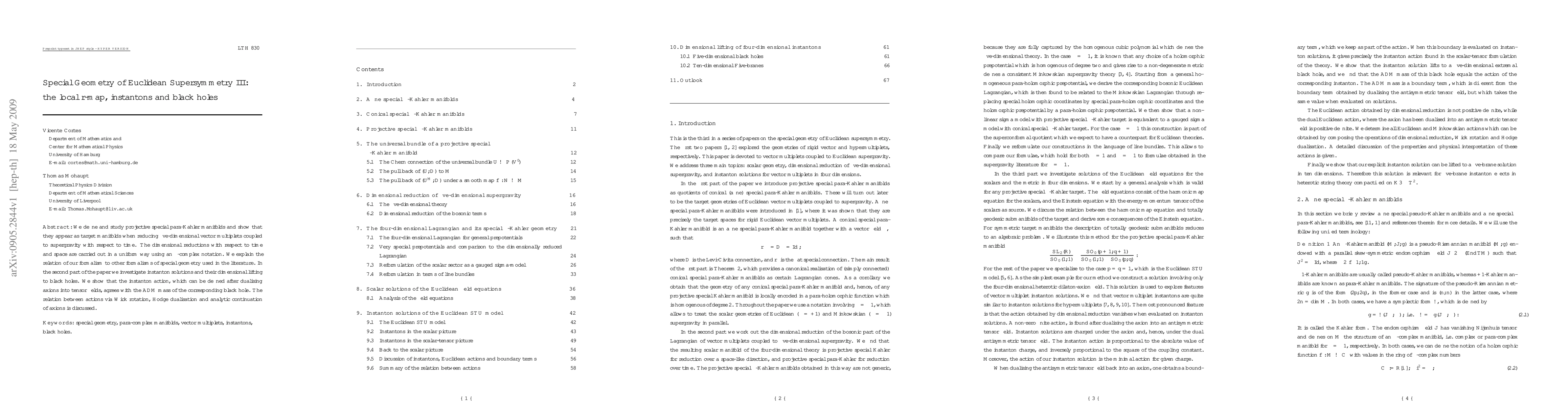 We define and study projective special para-Kahler manifolds and show that they appear as target manifolds when reducing five-dimensional vector multiplets coupled to supergravity with respect to time. The dimensional reductions with respect to time and space are carried out in a uniform way using an epsilon-complex notation. We explain the relation of our formalism to other formalisms of special geometry used in the literature. In the second part of the paper we investigate instanton solutions and their dimensional lifting to black holes. We show that the instanton action, which can be defined after dualising axions into tensor fields, agrees with the ADM mass of the corresponding black hole. The relation between actions via Wick rotation, Hodge dualisation and analytic continuation of axions is discussed.