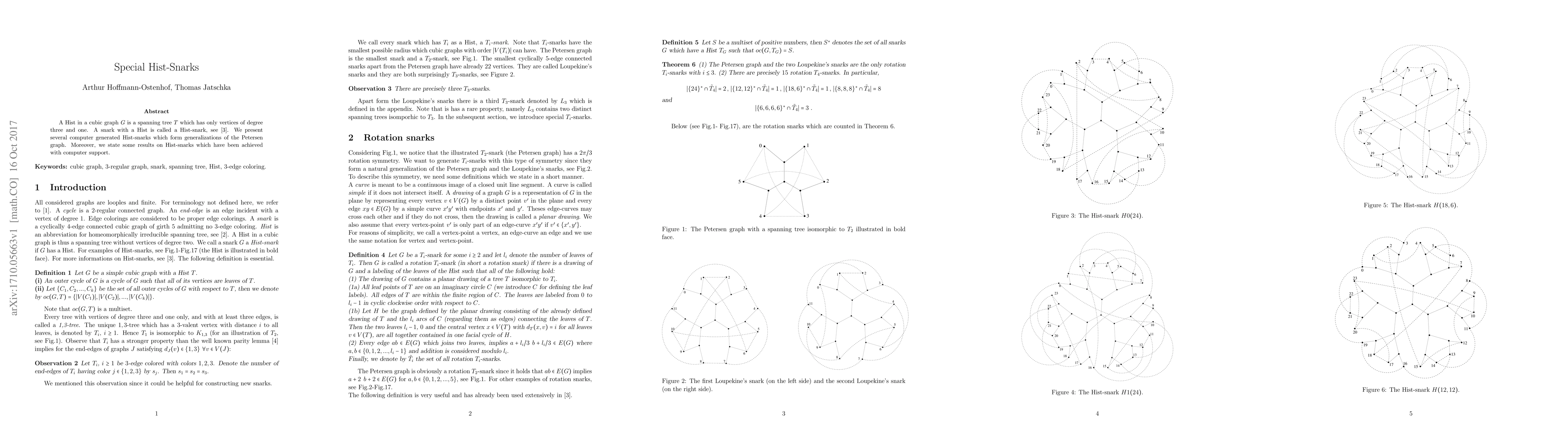 A Hist in a cubic graph $G$ is a spanning tree $T$ which has only vertices of degree three and one. A snark with a Hist is called a Hist-snark, see \cite{HO}. We present several computer generated Hist-snarks which form generalizations of the Petersen graph. Moreover, we state some results on Hist-snarks which have been achieved with computer support.