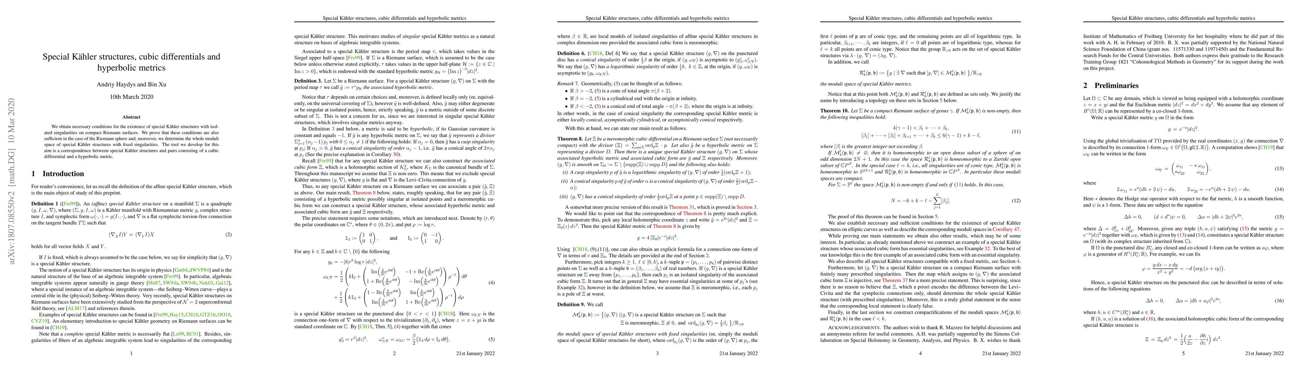 This paper establishes necessary and sufficient conditions for special Kähler structures on compact Riemann surfaces, particularly the Riemann sphere, using a correspondence with cubic differentials and hyperbolic metrics. It also determines the moduli space of such structures with fixed singularities.