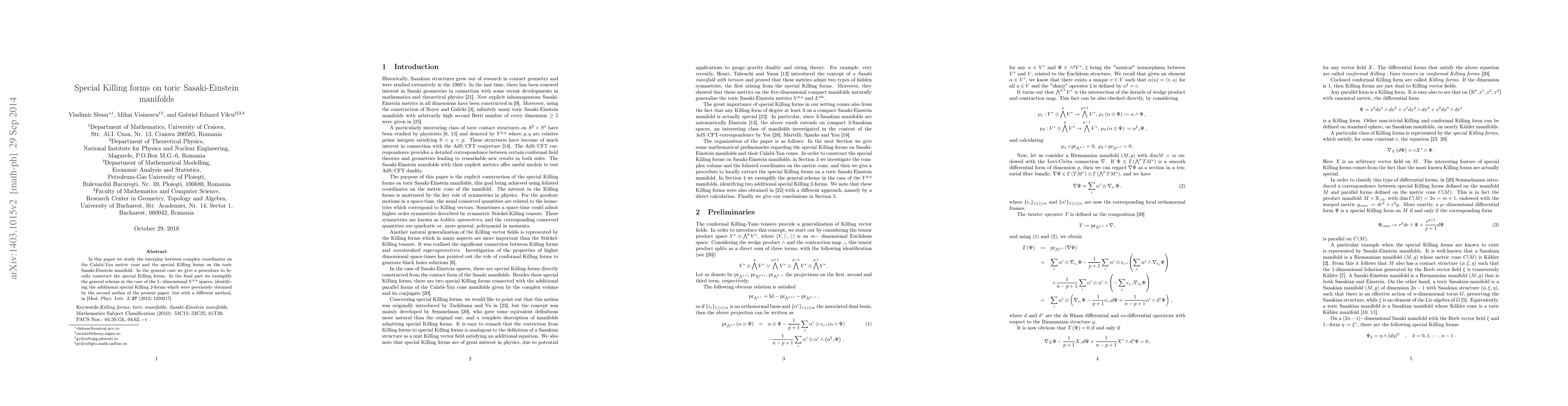 In this paper we study the interplay between complex coordinates on the Calabi-Yau metric cone and the special Killing forms on the toric Sasaki-Einstein manifold. In the general case we give a procedure to locally construct the special Killing forms. In the final part we exemplify the general scheme in the case of the $5-$dimensional $Y^{p,q}$ spaces, identifying the additional special Killing 2-forms which were previously obtained by the second author of the present paper, but with a different method, in [Mod. Phys. Lett. A 27 (2012) 1250217].