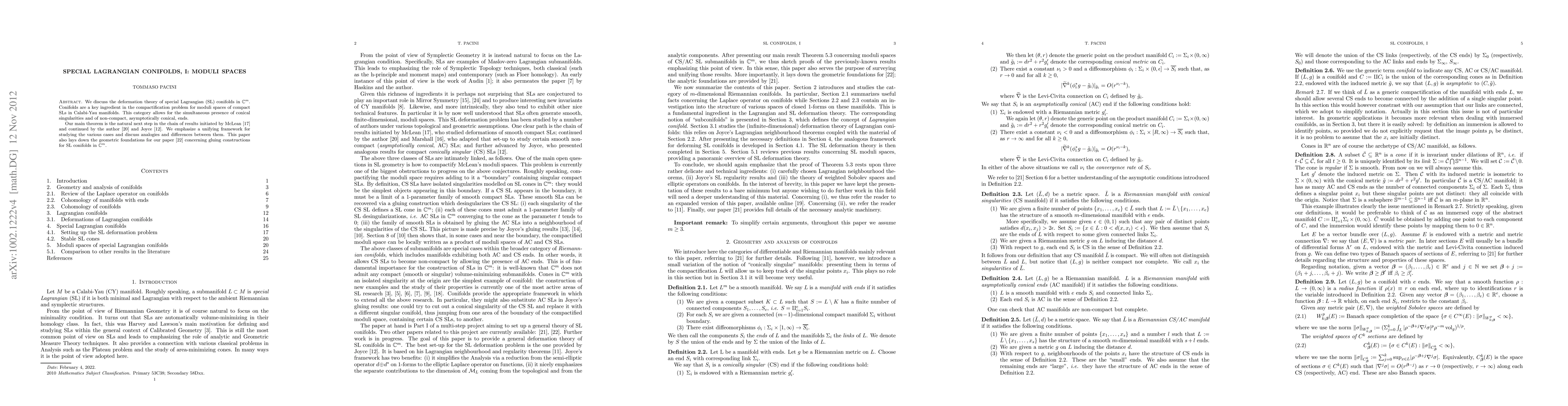 We discuss the deformation theory of special Lagrangian (SL) conifolds in complex space C^m. Conifolds are a key ingredient in the compactification problem for moduli spaces of compact SLs in Calabi-Yau manifolds. This category allows for the simultaneous presence of conical singularities and of non-compact, asymptotically conical, ends. Our main theorem is the natural next step in the chain of results initiated by McLean and continued by the author and by Joyce. We emphasize a unifying framework for studying the various cases and discuss analogies and differences between them. This paper also lays down the geometric foundations for our paper "Special Lagrangian conifolds, II" concerning gluing constructions for SL conifolds in C^m.