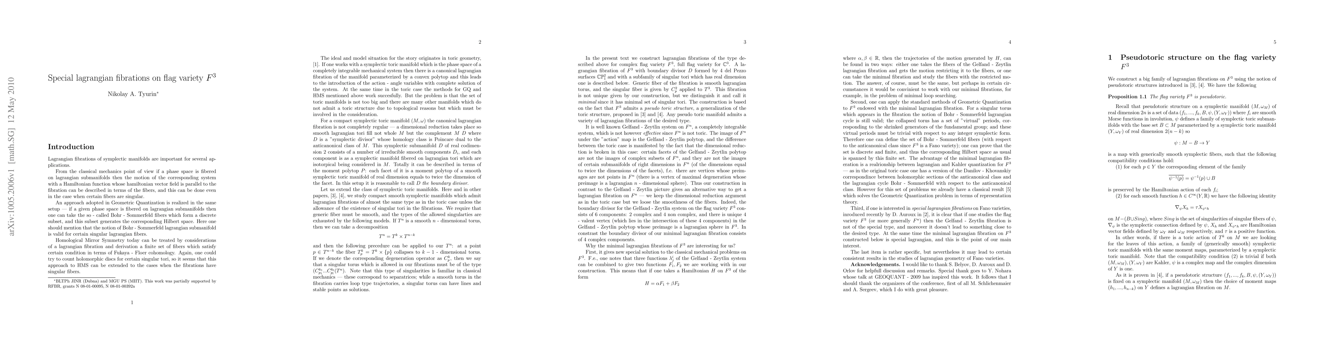 One constructs lagrangian fibrations on the flag variety $F^3$ and proves that the fibrations are special.