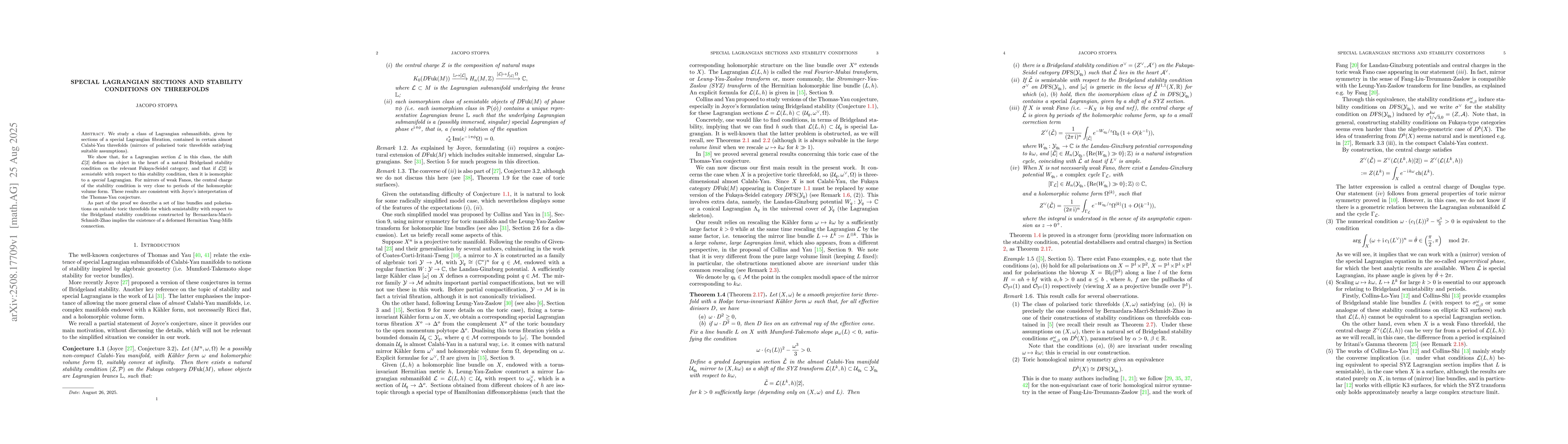 We study a class of Lagrangian submanifolds, given by sections of a special Lagrangian fibration, contained in certain almost Calabi-Yau threefolds (mirrors of polarised toric threefolds satisfying suitable assumptions). We show that, for a Lagrangian section $L$ in this class, the shift $L[2]$ defines an object in the heart of a natural Bridgeland stability condition on the relevant Fukaya-Seidel category, and that if $L[2]$ is semistable with respect to this stability condition, then it is isomorphic to a special Lagrangian. For mirrors of weak Fanos, the central charge of the stability condition is very close to periods of the holomorphic volume form. These results are consistent with Joyce's interpretation of the Thomas-Yau conjecture. As part of the proof we describe a set of line bundles and polarisations on suitable toric threefolds for which semistability with respect to the Bridgeland stability conditions constructed by Bernardara-Macr\`i-Schmidt-Zhao implies the existence of a deformed Hermitian Yang-Mills connection.