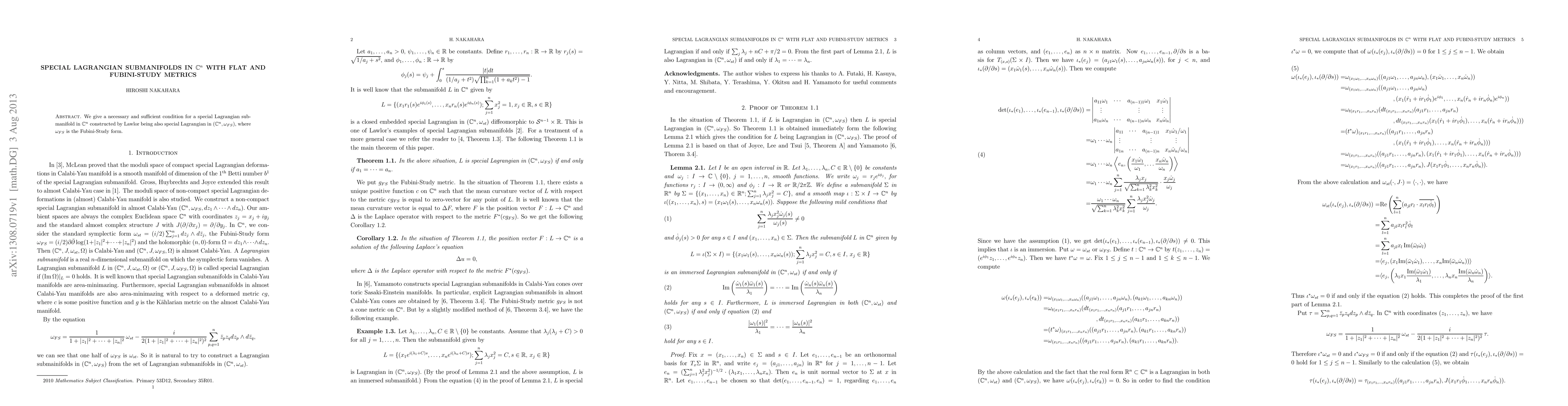 This paper provides a condition for special Lagrangian submanifolds in C^n with flat metric to also be special Lagrangian in C^n with Fubini-Study form, allowing them to generalize across different metrics.