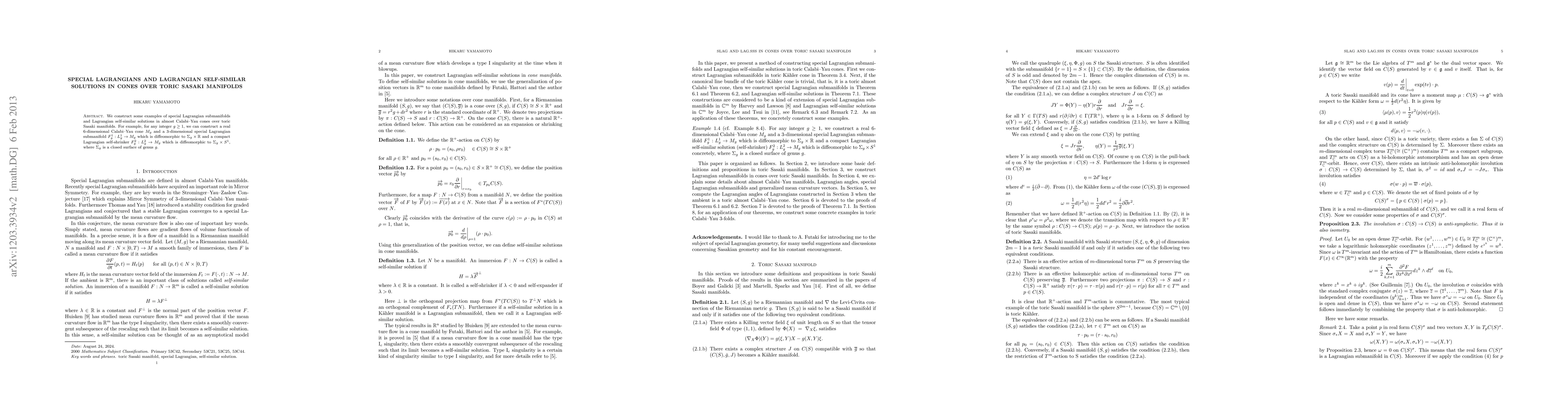 Two-line summary: This paper constructs special Lagrangian submanifolds and Lagrangian self-similar solutions in almost Calabi-Yau cones over toric Sasaki manifolds. Specifically, it presents a real 6-dimensional Calabi-Yau cone M_g with a 3-dimensional special Lagrangian submanifold L^1_g and a compact Lagrangian self-shrinker L^2_g, both diffeomorphic to products involving a closed surface of genus g and either R or S^1.