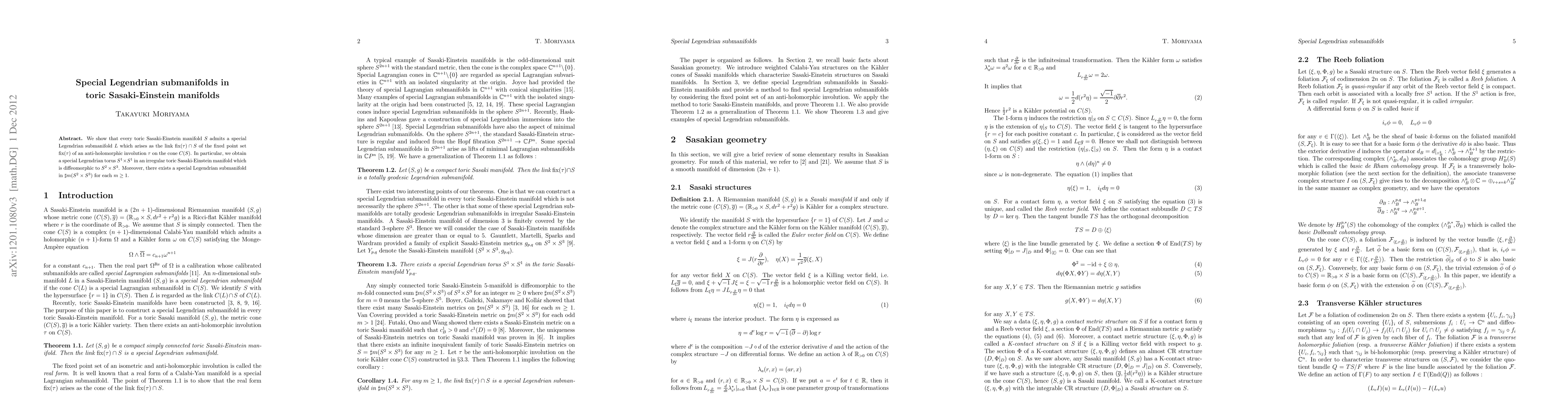 We show that every toric Sasaki-Einstein manifold $S$ admits a special Legendrian submanifold $L$ which arises as the link ${\rm fix}(\tau)\cap S$ of the fixed point set ${\rm fix}(\tau)$ of an anti-holomorphic involution $\tau$ on the cone $C(S)$. In particular, an irregular toric Sasaki-Einstein manifold $S^{2}\times S^{3}$ has a special Legendrian torus $S^{1}\times S^{1}$. Moreover, we also obtain a special Legendrian submanifold in $\sharp m(S^{2}\times S^{3})$ for each $m\ge 1$.