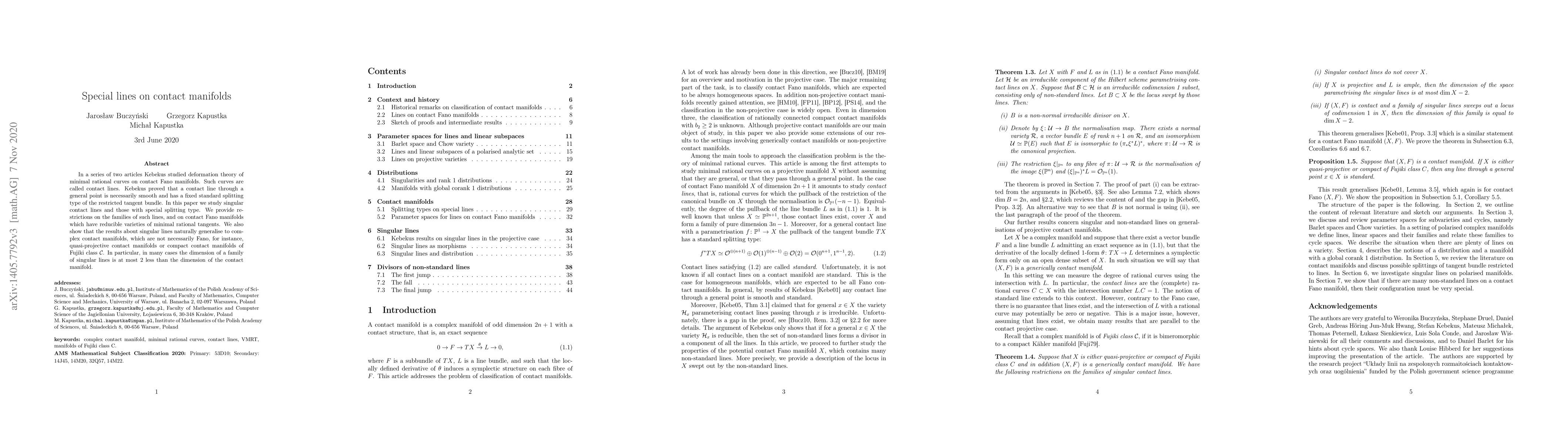 This paper examines singular contact lines on contact Fano manifolds and their special splitting types, providing restrictions on these lines and related contact Fano manifolds. It also extends findings about singular lines to complex contact manifolds, showing that in many cases, the dimension of singular line families is at most 2 less than the dimension of the contact manifold.