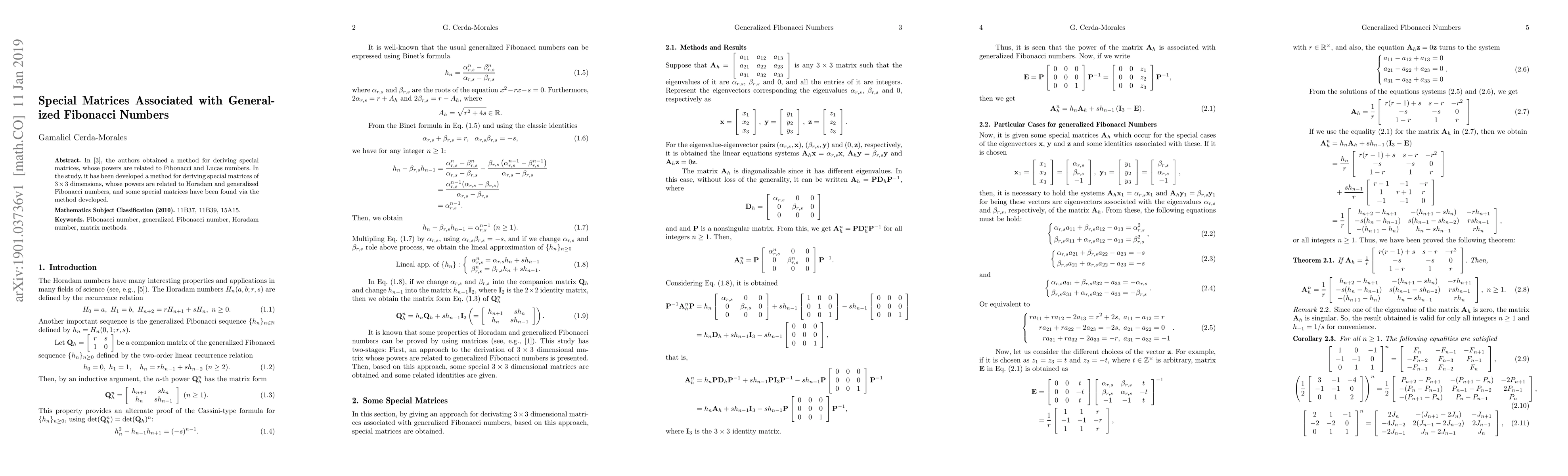 In \cite{Ka}, the authors obtained a method for deriving special matrices, whose powers are related to Fibonacci and Lucas numbers. In the study, it has been developed a method for deriving special matrices of $3\times 3$ dimensions, whose powers are related to Horadam and generalized Fibonacci numbers, and some special matrices have been found via the method developed.