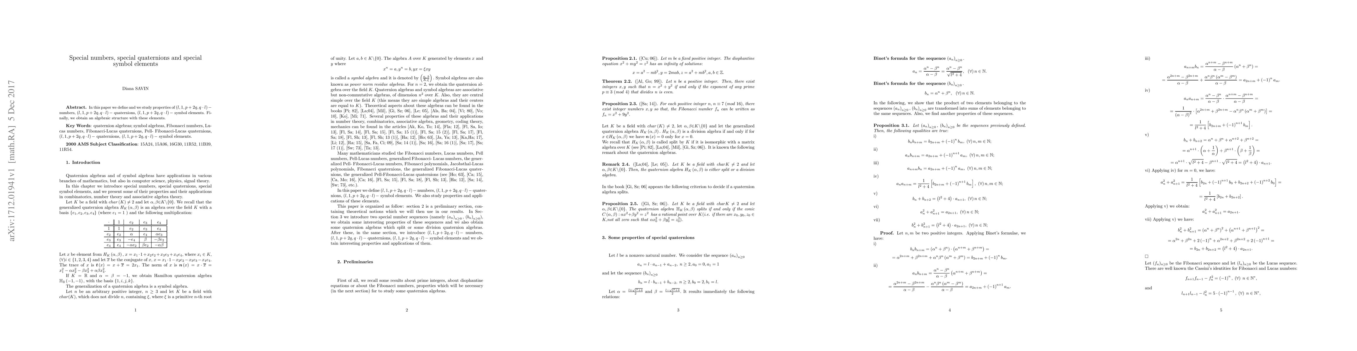 {\small In this paper we define and we study properties of} $\left(l,1,p+2q,q\cdot l\right) -$ {\small numbers,} $\left(l,1,p+2q,q\cdot l\right) -$ {\small quaternions,} $\left(l,1,p+2q,q\cdot l\right) -$ {\small symbol elements. Finally, we obtain an algebraic structure with these elements.}