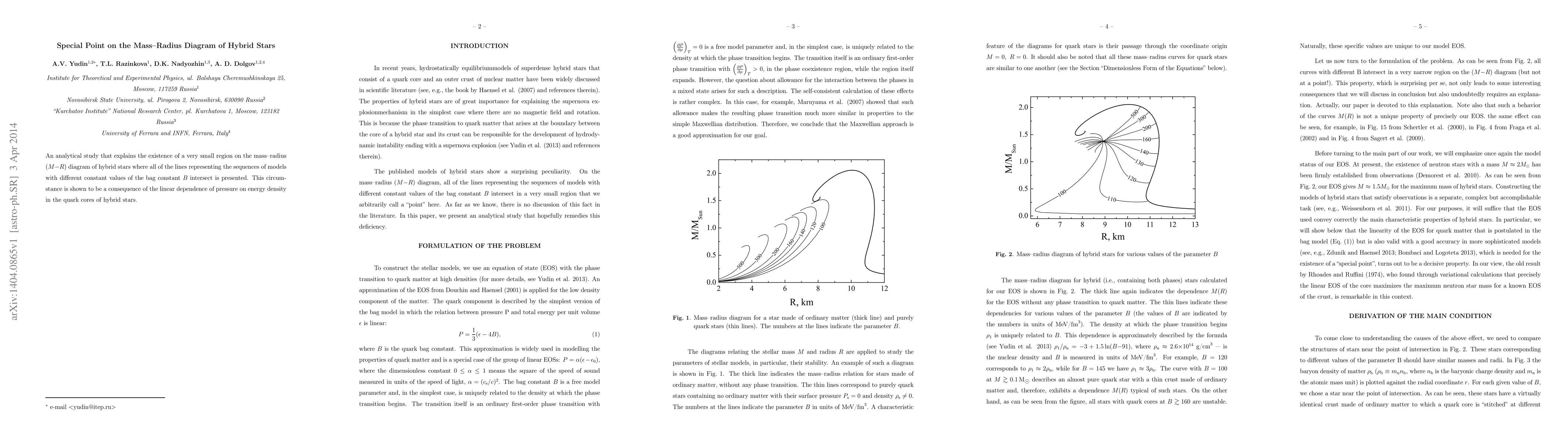 The paper identifies a unique intersection point on the mass-radius diagram of hybrid stars, resulting from linear pressure-energy density dependence in quark cores. This occurs due to varying constant bag constants B in models.