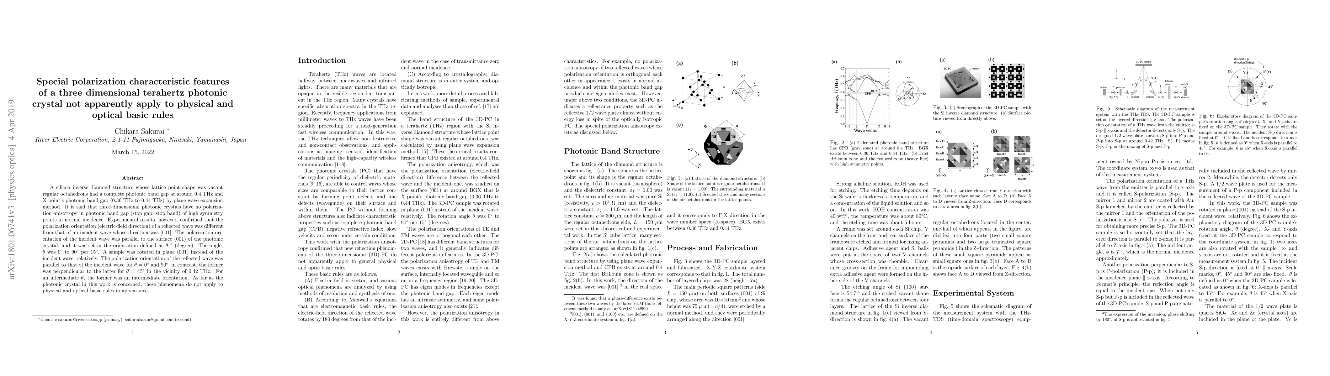 This research presents a silicon photonic crystal with a complete band gap at ~0.4 THz, challenging conventional polarization rules. Experimental findings show reflected wave polarization differs from incident wave orientation at [001], with unique behavior around 0.42 THz, defying standard physical and optical principles.