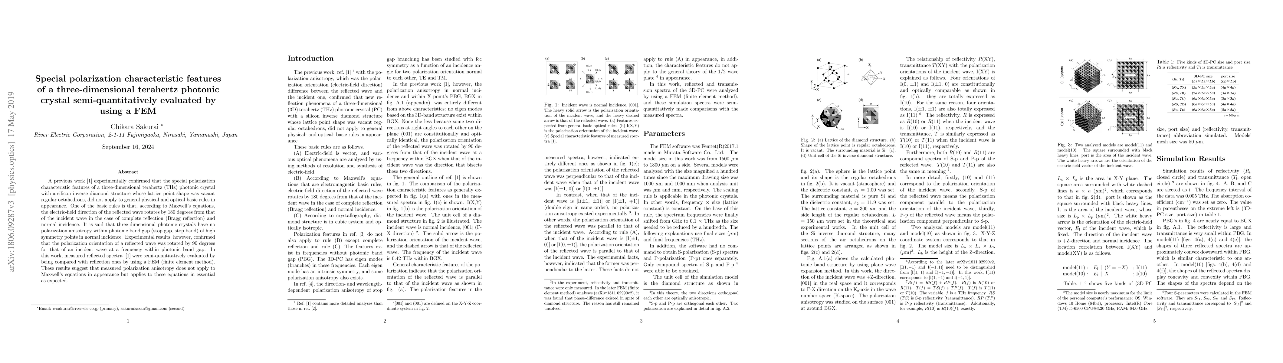 A previous work [1] experimentally confirmed that the special polarization characteristic features of a three-dimensional terahertz (THz) photonic crystal with a silicon inverse diamond structure whose lattice point shape was vacant regular octahedrons, did not apply to general physical and optical basic rules in appearance. One of the basic rules is that, according to Maxwell's equations, the electric-field direction of the reflected wave rotates by 180 degrees from that of the incident wave in the case of complete reflection (Bragg reflection) and normal incidence. It is said that three-dimensional photonic crystals have no polarization anisotropy within photonic band gap (stop gap, stop band) of high symmetry points in normal incidence. Experimental results, however, confirmed that the polarization orientation of a reflected wave was rotated by 90 degrees for that of an incident wave at a frequency within photonic band gap. In this work, measured reflected spectra [1] were semi-quantitatively evaluated by being compared with reflection ones by using a FEM (finite element method). These results suggest that measured polarization anisotropy does not apply to Maxwell's equations in appearance but applies to these equations in essential as expected.
