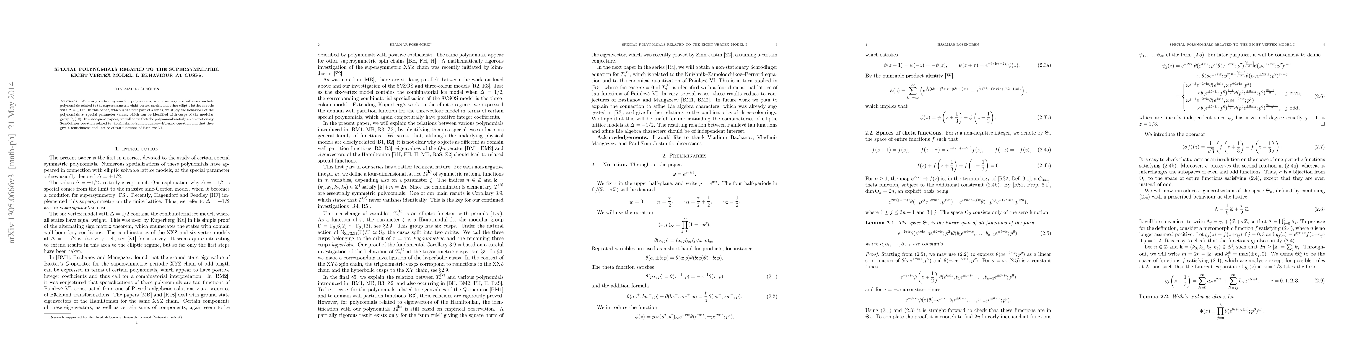This paper investigates symmetric polynomials linked to the supersymmetric eight-vertex model and other elliptic lattice models, focusing on their behavior at special parameter values corresponding to cusps of the modular group $\Gamma_0(12)$. Future work will demonstrate their connection to a non-stationary Schrödinger equation and their role in generating a four-dimensional lattice of tau functions for Painlevé VI.