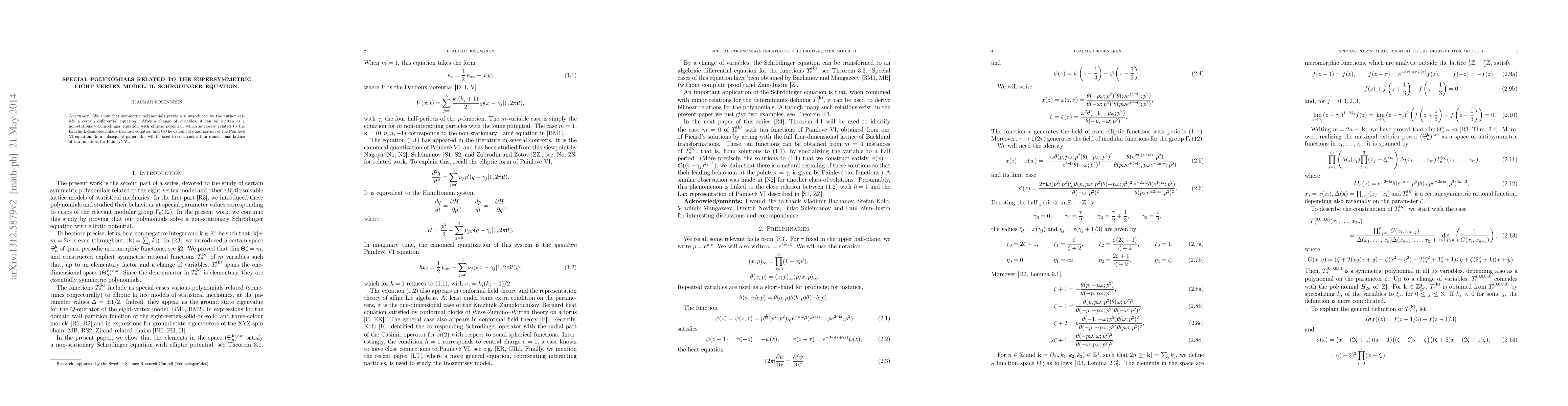 This paper demonstrates that symmetric polynomials linked to the supersymmetric eight-vertex model satisfy a non-stationary Schrödinger equation with an elliptic potential, closely tied to the Knizhnik-Zamolodchikov equation and the Painlevé VI equation's canonical quantization. Future work will utilize this result to build a four-dimensional lattice of tau functions for Painlevé VI.