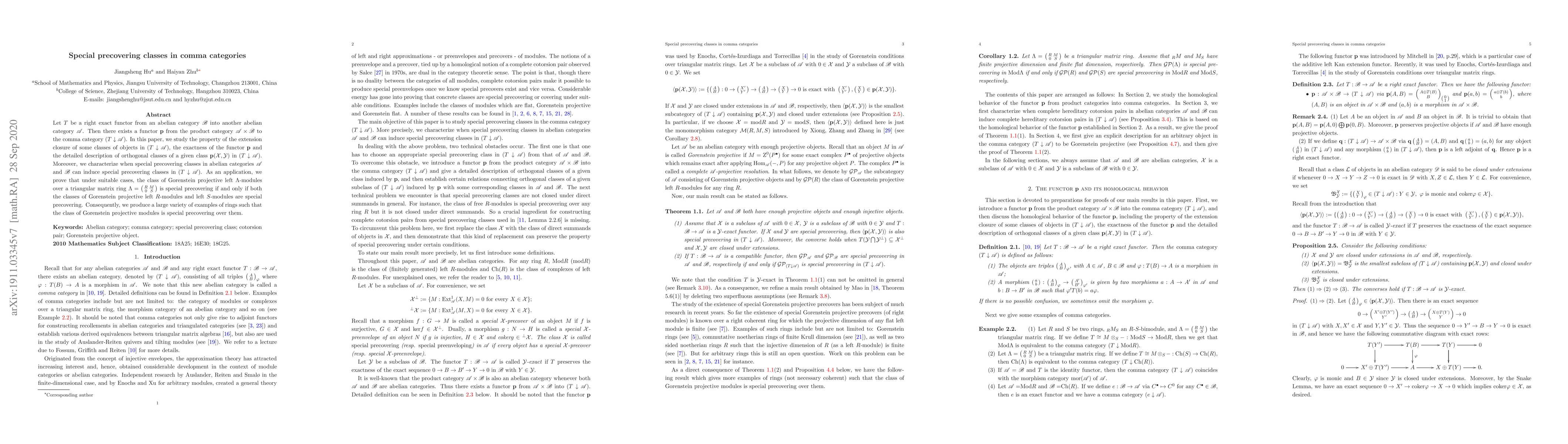 This paper investigates the relationship between special precovering classes in abelian categories $\mathscr{A}$ and $\mathscr{B}$ under a right exact functor $T$, exploring the properties of a functor ${\bf p}$ and its induced classes in the comma category $(T\downarrow\mathscr{A})$. It concludes by proving that under certain conditions, the Gorenstein projective modules over a specific triangular matrix ring are special precovering if both component classes in $R$ and $S$ are special precovering.