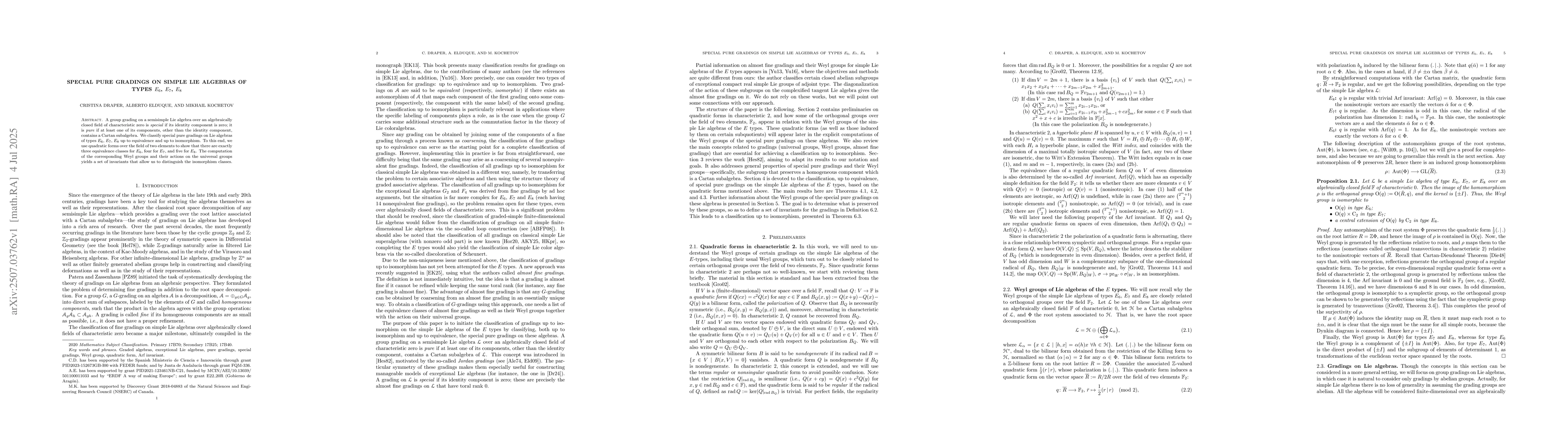 A group grading on a semisimple Lie algebra over an algebraically closed field of characteristic zero is special if its identity component is zero; it is pure if at least one of its components, other than the identity component, contains a Cartan subalgebra. We classify special pure gradings on Lie algebras of types $E_6$, $E_7$, $E_8$ up to equivalence and up to isomorphism. To this end, we use quadratic forms over the field of two elements to show that there are exactly three equivalence classes for $E_6$, four for $E_7$, and five for $E_8$. The computation of the corresponding Weyl groups and their actions on the universal groups yields a set of invariants that allow us to distinguish the isomorphism classes.