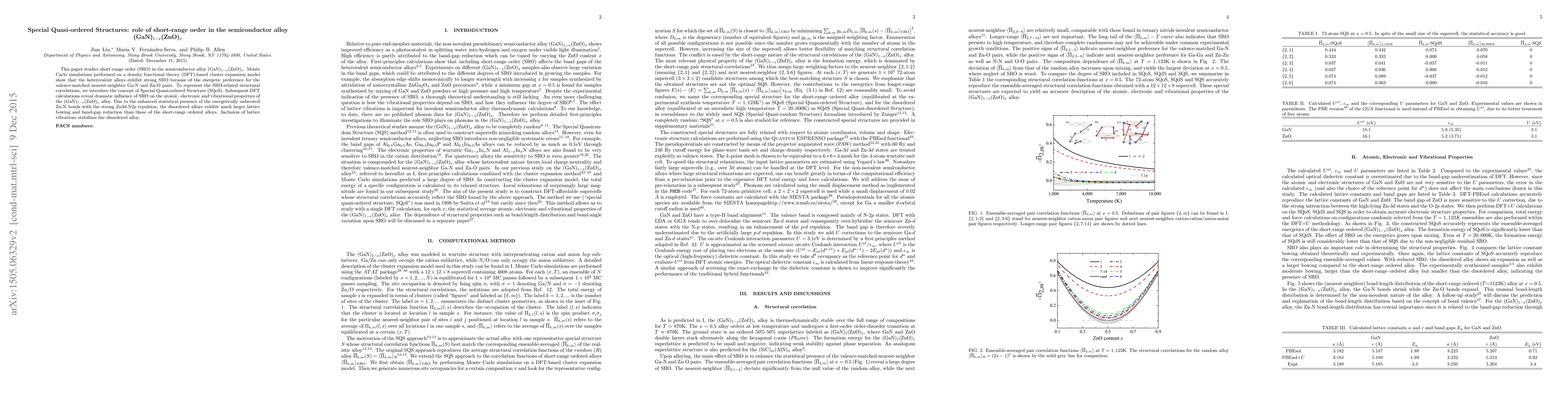This paper studies short-range order (SRO) in the semiconductor alloy (GaN)$_{1-x}$(ZnO)$_x$. Monte Carlo simulations performed on a density functional theory (DFT)-based cluster expansion model show that the heterovalent alloys exhibit strong SRO because of the energetic preference for the valence-matched nearest-neighbor Ga-N and Zn-O pairs. To represent the SRO-related structural correlations, we introduce the concept of Special Quasi-ordered Structure (SQoS). Subsequent DFT calculations reveal dramatic influence of SRO on the atomic, electronic and vibrational properties of the (GaN)$_{1-x}$(ZnO)$_x$ alloy. Due to the enhanced statistical presence of the energetically unfavored Zn-N bonds with the strong Zn3$d$-N2$p$ repulsion, the disordered alloys exhibit much larger lattice bowing and band-gap reduction than those of the short-range ordered alloys. Inclusion of lattice vibrations stabilizes the disordered alloy.