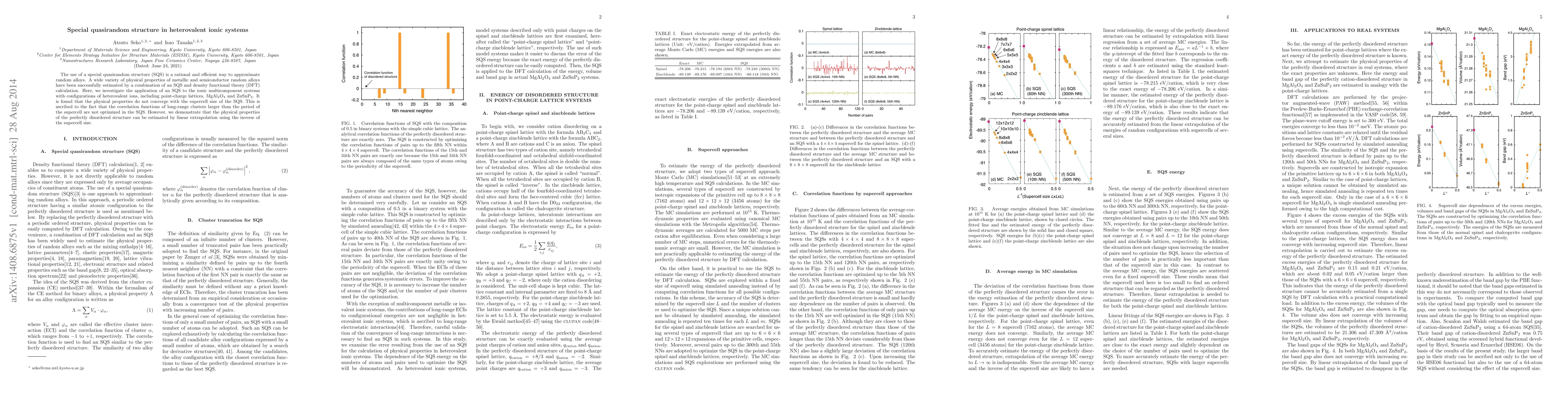 This paper explores the application of special quasirandom structures (SQS) to heterovalent ionic systems, finding that physical properties do not converge with supercell size due to unoptimized long-range correlations. It concludes that linear extrapolation based on the inverse of the supercell size can estimate properties of perfectly disordered structures.