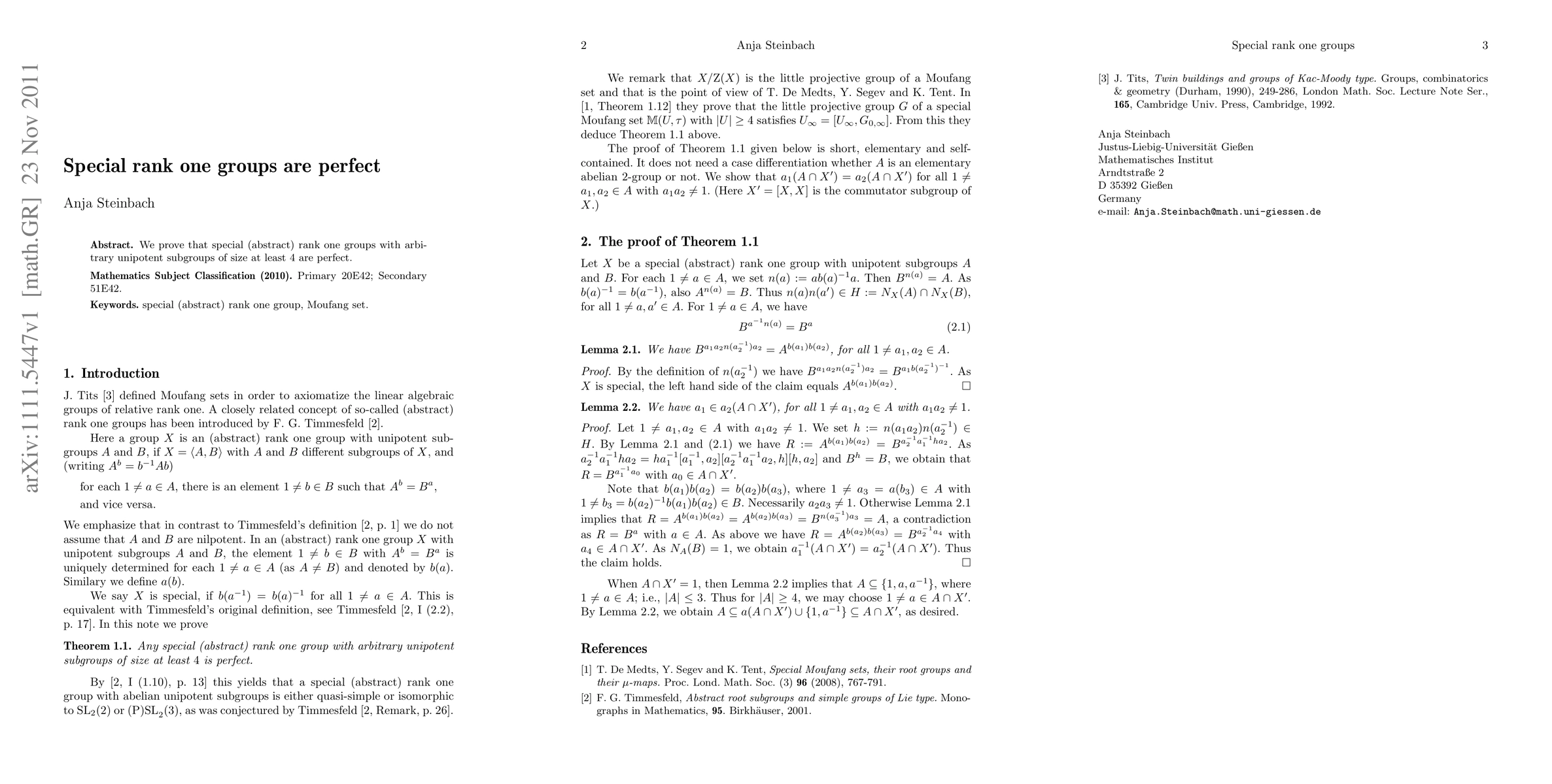 T. De Medts, Y. Segev and K. Tent [Special Moufang sets, their root groups and their \mu-maps, Proc. Lond. Math. Soc. (3) 96 (2008), 767-791] proved that the little projective group of a special Moufang set M(U,\tau) is perfect provided that U has size at least 4. We give a short, elementary and self-contained argument, working with Timmesfeld's concept of special (abstract) rank one groups with arbitrary unipotent subgroups [Abstract root subgroups and simple groups of Lie type, Monographs in Mathematics, 95. Birkh\"auser, 2001].