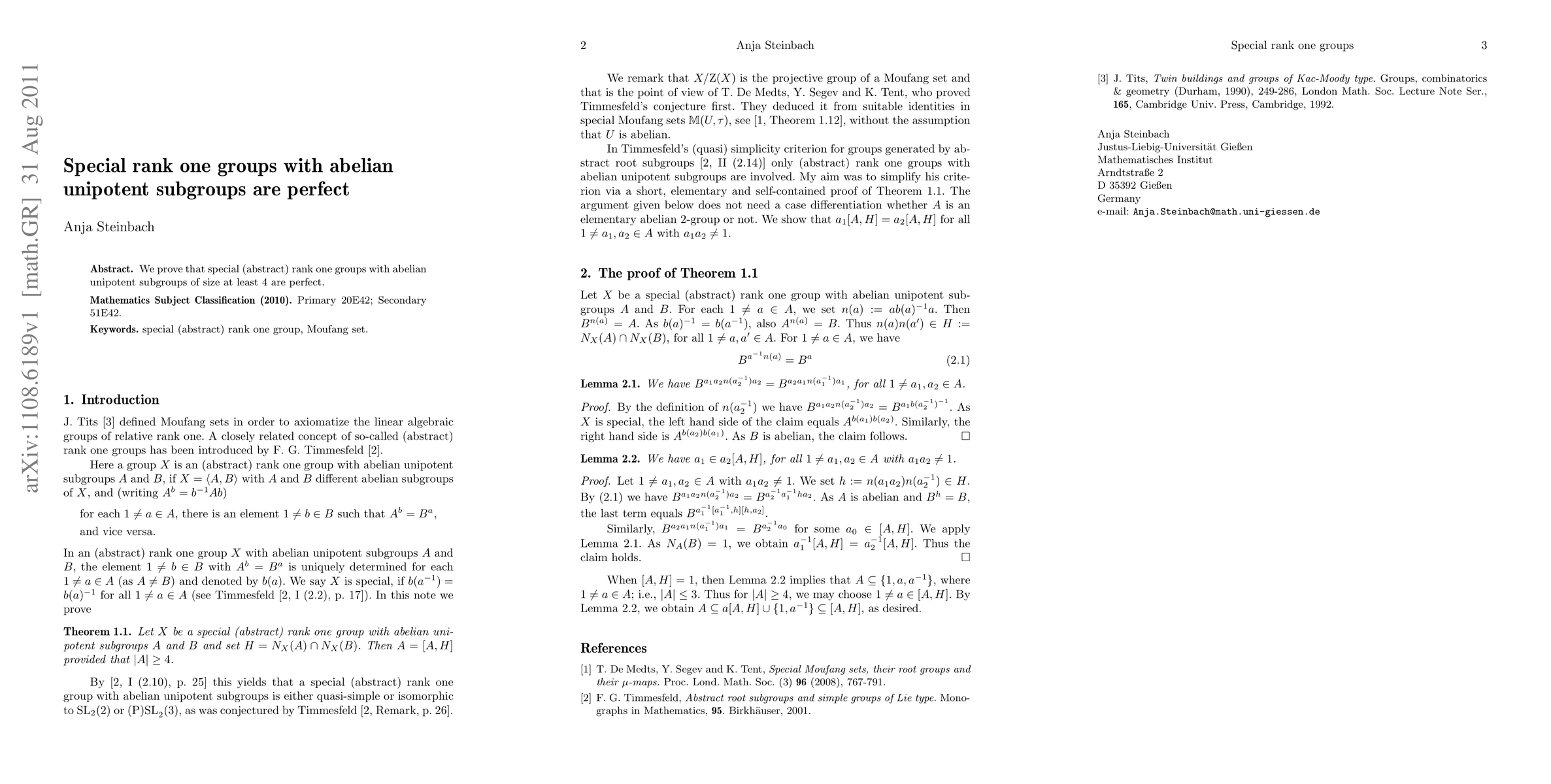 T. De Medts, Y. Segev and K. Tent [Special Moufang sets, their root groups and their \mu-maps, Proc. Lond. Math. Soc. (3) 96 (2008), 767-791] proved that the little projective group of a special Moufang set M(U,\tau) is perfect provided that U has size at least 4. We give a short, elementary and self-contained argument when U is abelian, working with Timmesfeld's concept of special (abstract) rank one groups with abelian unipotent subgroups [Abstract root subgroups and simple groups of Lie type, Monographs in Mathematics, 95. Birkh\"auser, 2001]. This simplifies Timmesfeld's (quasi) simplicity criterion for groups generated by abstract root subgroups [loc. cit., II (2.14)].