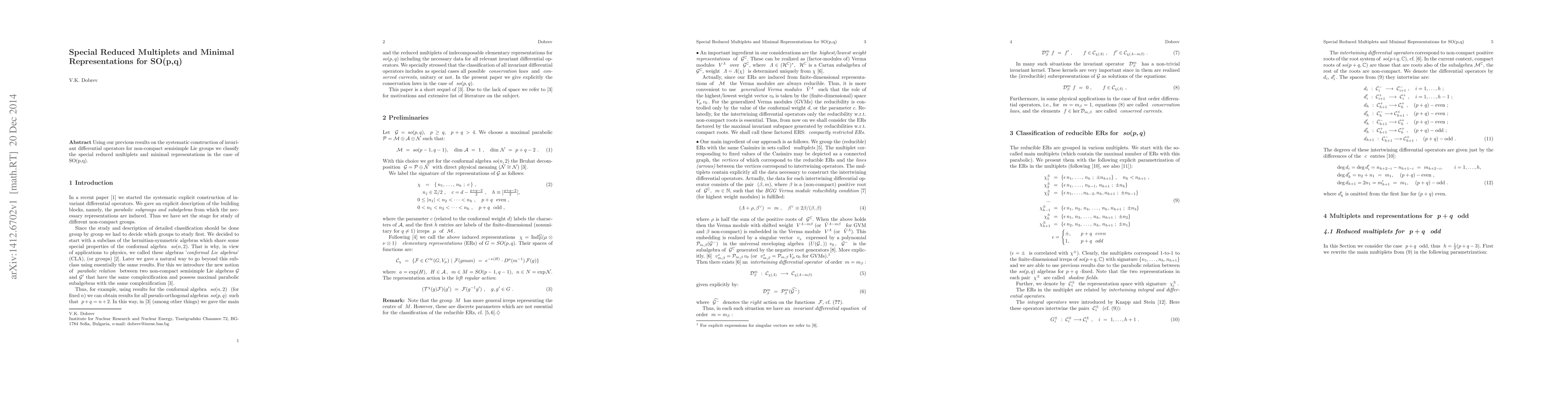 Using our previous results on the systematic construction of invariant differential operators for non-compact semisimple Lie groups we classify the special reduced multiplets and minimal representations in the case of SO(p,q).
