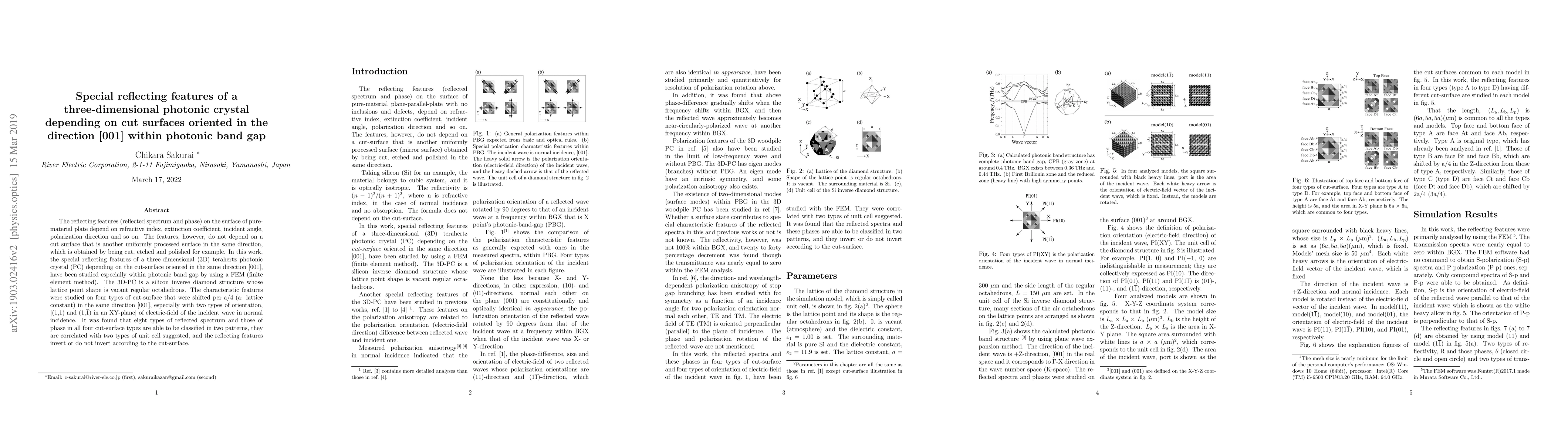 This research uses the finite element method to study the reflecting features of a 3D terahertz photonic crystal, a silicon inverse diamond structure, focusing on cut surfaces oriented along [001]. It finds that these reflecting features, including spectrum and phase, can be categorized into two patterns based on two suggested unit cells, and their inversion or non-inversion depends on the cut-surface orientation.