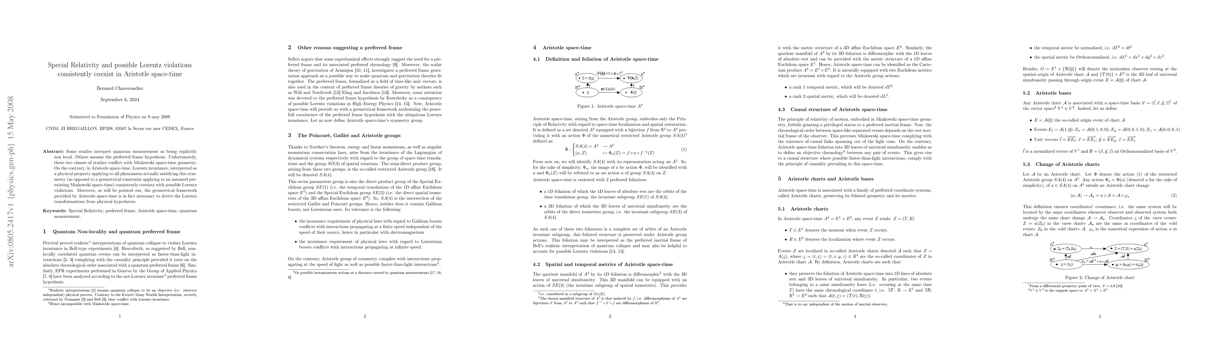 Some studies interpret quantum measurement as being explicitly non local. Others assume the preferred frame hypothesis. Unfortunately, these two classes of studies conflict with Minkowski space-time geometry. On the contrary, in Aristotle space-time, Lorentz invariance, interpreted as a physical property applying to all phenomena actually satisfying this symmetry (as opposed to a geometrical constraint applying to an assumed pre-existing Minkowski space-time) consistently coexists with possible Lorentz violations. Moreover, as will be pointed out, the geometrical framework provided by Aristotle space-time is in fact necessary to derive the Lorentz transformations from physical hypotheses.