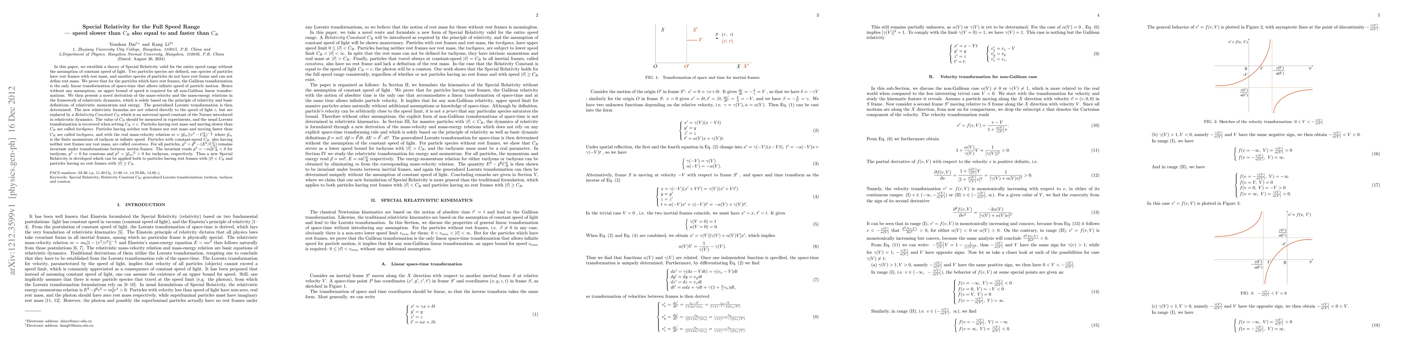 This paper introduces a new theory of Special Relativity that allows for variable speed of light and defines three types of particles: tardyons (moving slower than a constant speed $C_R$), tachyons (moving faster than $C_R$), and constons (moving at the constant speed $C_R$).