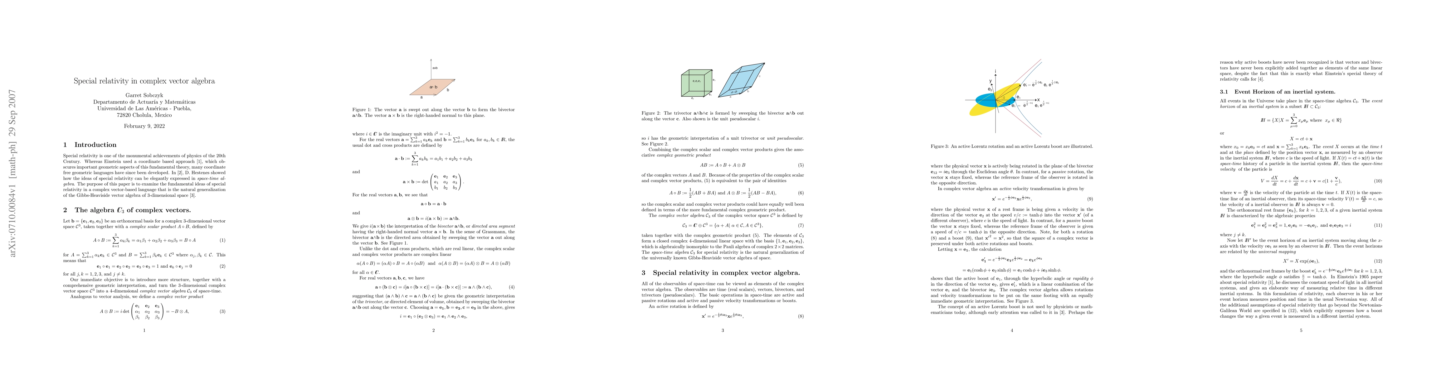 A new algebraic framework is proposed to describe special relativity using complex vector algebra, offering an alternative to existing mathematical languages like Minkowski space-time algebra.