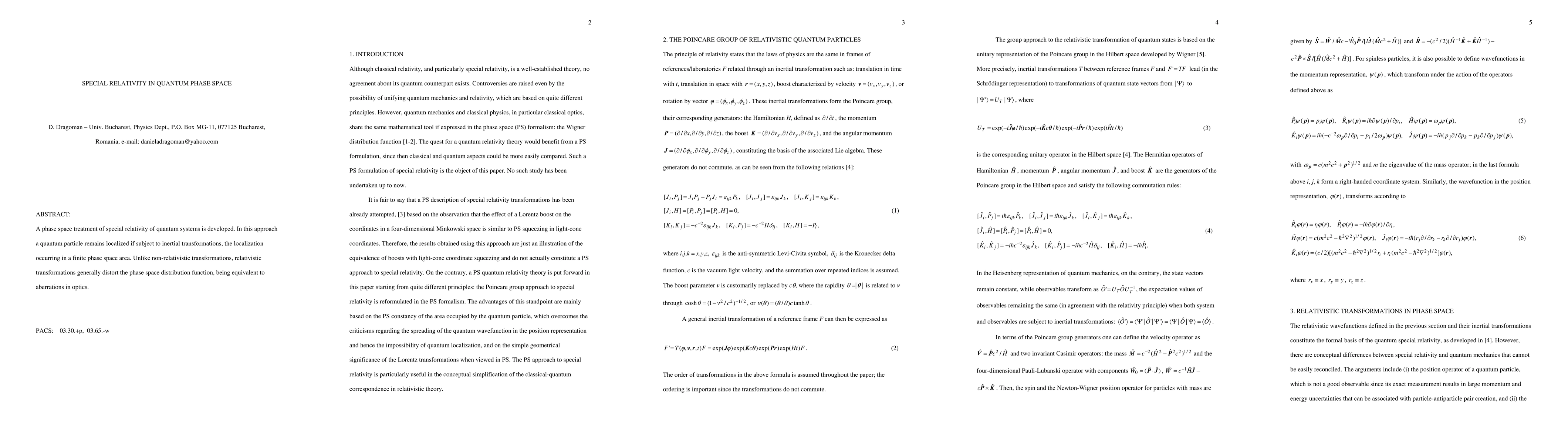 This paper develops a phase space treatment of special relativity for quantum systems, showing that quantum particles remain localized under inertial transformations within a finite phase space area, while relativistic transformations distort the phase space distribution function akin to optical aberrations.