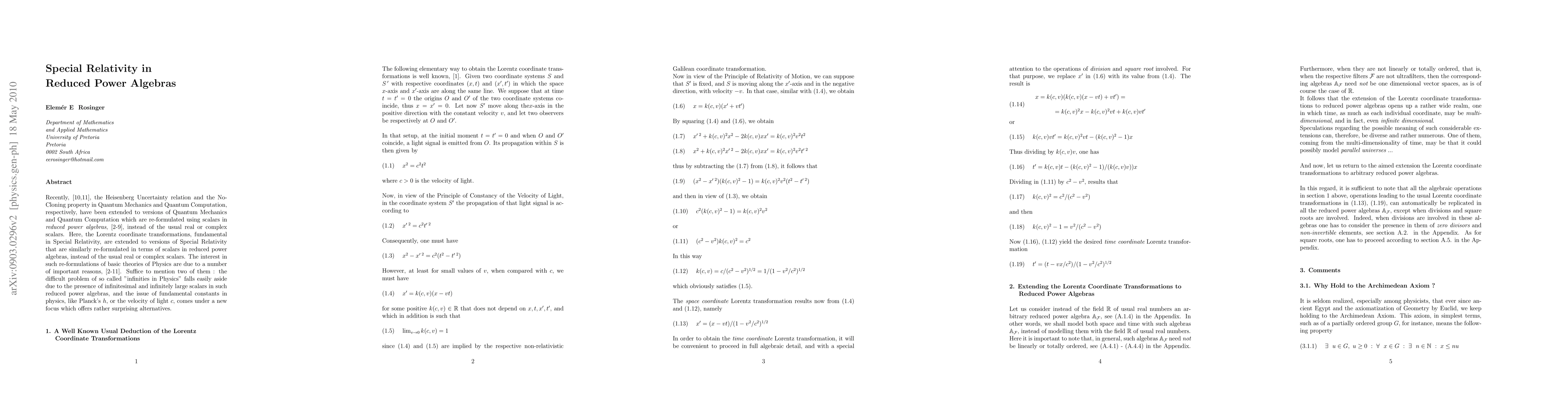This paper extends Lorentz coordinate transformations of Special Relativity to formulations using scalars in reduced power algebras, addressing issues like infinities in physics and offering new perspectives on fundamental constants.