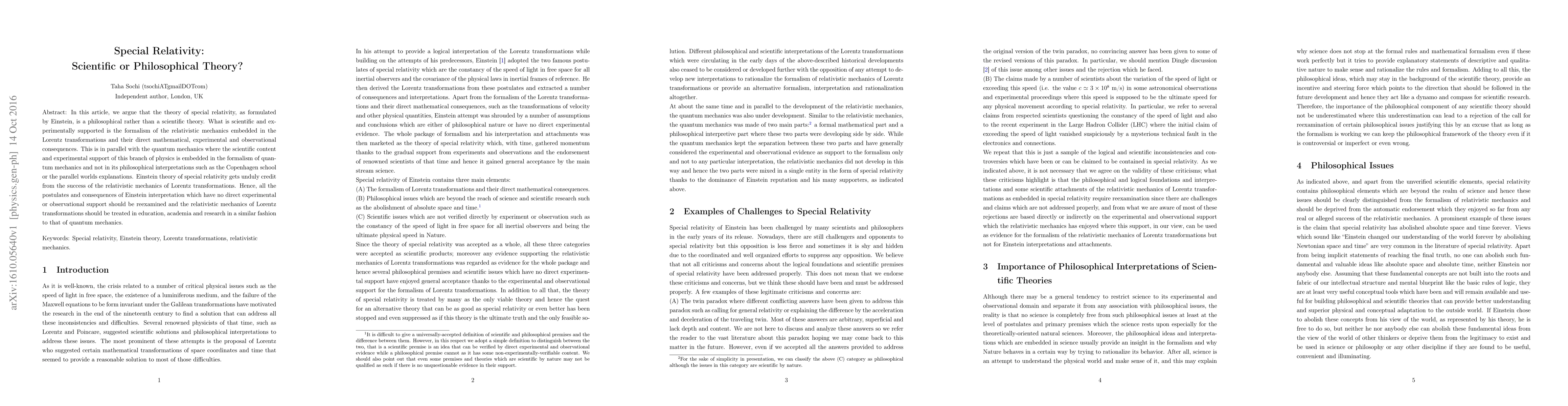 In this article, we argue that the theory of special relativity, as formulated by Einstein, is a philosophical rather than a scientific theory. What is scientific and experimentally supported is the formalism of the relativistic mechanics embedded in the Lorentz transformations and their direct mathematical, experimental and observational consequences. This is in parallel with the quantum mechanics where the scientific content and experimental support of this branch of physics is embedded in the formalism of quantum mechanics and not in its philosophical interpretations such as the Copenhagen school or the parallel worlds explanations. Einstein theory of special relativity gets unduly credit from the success of the relativistic mechanics of Lorentz transformations. Hence, all the postulates and consequences of Einstein interpretation which have no direct experimental or observational support should be reexamined and the relativistic mechanics of Lorentz transformations should be treated in education, academia and research in a similar fashion to that of quantum mechanics.